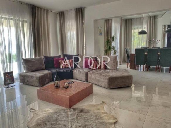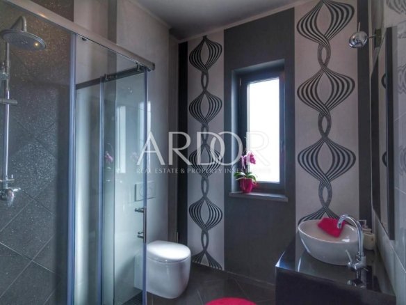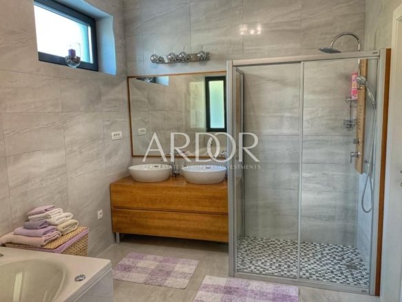 Ova impozantna građevina rezultat je pomne pažnje prema detaljima i upotrebe visokokvalitetnih materijala. Elegantni podovi od hrasta i bambusa u kombinaciji s talijanskom keramikom, sustav podnog grijanja i klimatizacije stvaraju luksuzno i udobno okruženje tijekom cijele godine. Vila također uključuje vrhunsku ALU-PVC stolariju s troslojnim izolacijskim staklom, te dodatnu termoizolaciju od kamene vune, što pridonosi energetskoj učinkovitosti i privatnosti.