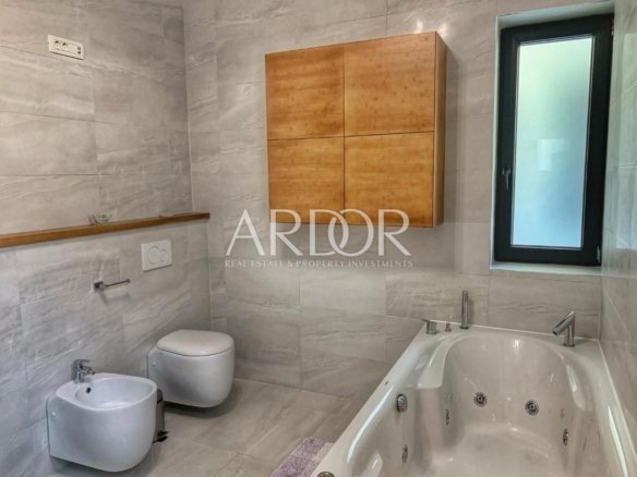 Dieses imposante Gebäude ist das Ergebnis einer sorgfältigen Liebe zum Detail und der Verwendung hochwertigster Materialien. Elegante Eichen- und Bambusböden in Kombination mit italienischer Keramik, Fußbodenheizung und Klimaanlage schaffen ein luxuriöses und komfortables Ambiente das ganze Jahr über. Die Villa ist zudem mit hochwertigen ALU-PVC-Fenstern mit dreischichtigem Isolierglas und zusätzlicher Wärmedämmung aus Steinwolle ausgestattet, was zur Energieeffizienz und Privatsphäre beiträgt.