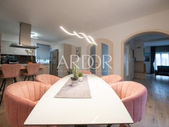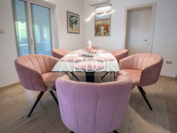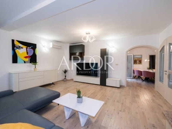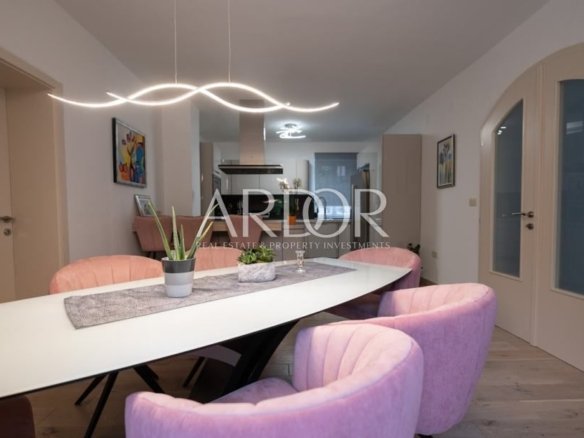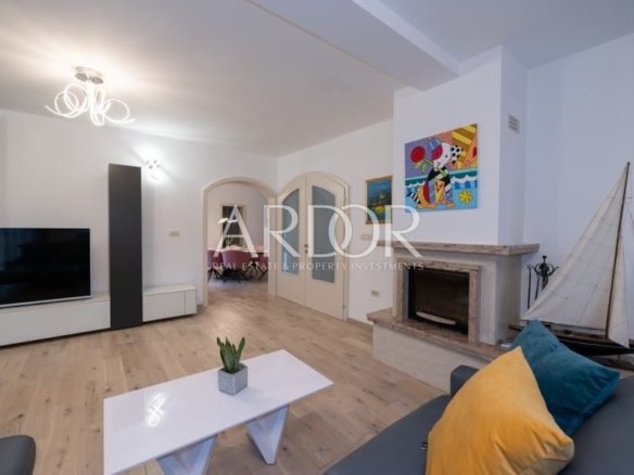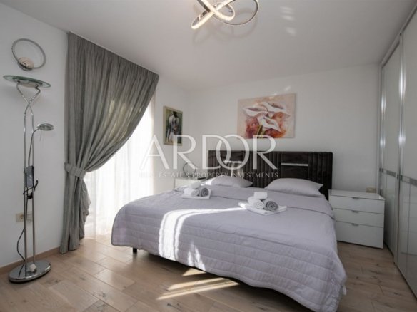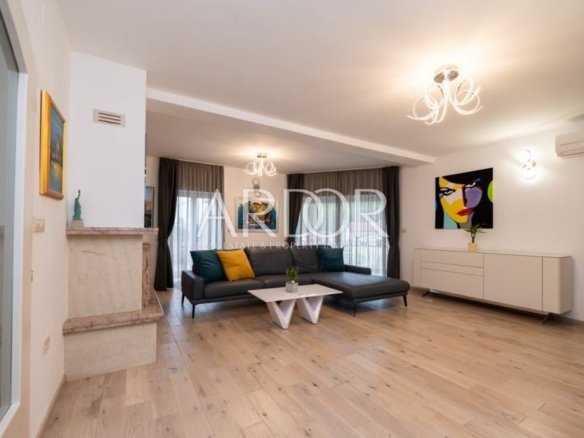 Prizemlje i prvi kat čine dvoetažni stan s dvije luksuzne sobe, kupaonicama, terasama, dnevnim boravkom, kuhinjom i blagovaonicom. Tu je i natkrivena terasa s roštiljem, kaminom i bazenom.