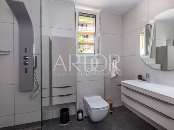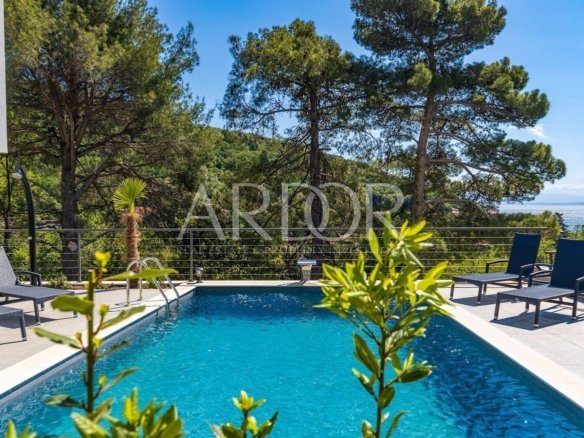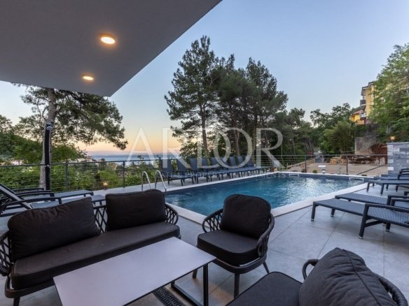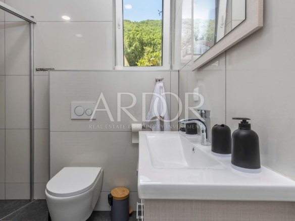 Na prodaju je novoizgrađena dvojna kuća – vila površine 201 m2, koja se nalazi u neposrednoj blizini Mošćeničke Drage. Ova vila čini dio kompleksa koji uključuje ukupno tri vile. Kuća se prostire na tri etaže: suteren, prizemlje i prvi kat. U suterenu se nalazi prostor za opuštanje i uživanje – wellness, te strojarnica za potrebe kuće i jedan toalet. Prizemlje je rezervirano za dnevni boravak, kuhinju, blagovaonicu i još jedan sanitarni čvor.Unutarnje stubište vodi na kat gdje se nalaze tri prostrane spavaće sobe, svaka sa svojom kupaonicom.Osim unutarnjeg prostora, kuća nudi i predivno uređenu okućnicu s bazenom veličine 36m2. S obzirom na povoljan položaj, s terase se pruža izvanredan pogled na more, te predivnu borovu šumu. Ova vila izgrađena je s naglaskom na visoki standard kvalitete, što jamči udoban i luksuzan život. Kuća je potpuno uređena i namještena, te opremljena modernim sigurnosnim sustavom videonadzora. Vila ima podno grijanje koje koristi Daikin sustav te klima uređaje u svim prostorijama. Ova nekretnina prodaje se u potpunosti opremljena namještajem, što znači da ćete odmah moći useliti i početi uživati u svom novom domu.