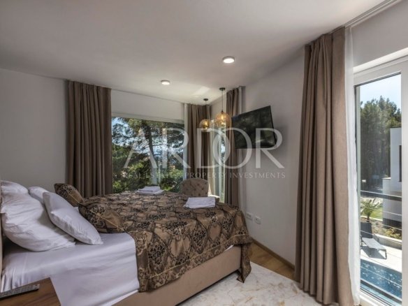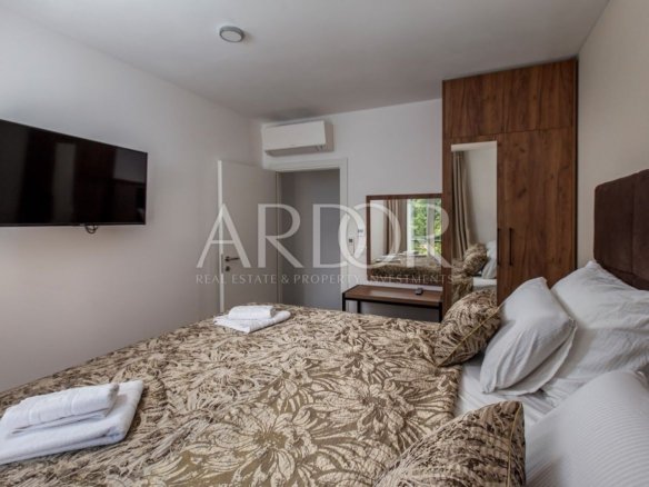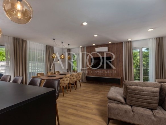 Wir haben in unserem Angebot ein neu gebautes Doppelhaus – eine Villa mit einer Fläche von 201 m2, in unmittelbarer Nähe von Mošćenička Draga. Diese Villa ist Teil eines Komplexes bestehend aus insgesamt drei Villen. Das Haus erstreckt sich über drei Etagen: Keller, Erdgeschoss und erster Stock. Im Keller gibt es einen Raum für Entspannung und Unterhaltung – Wohlbefinden, sowie einen Maschinenraum für den Haushaltsbedarf und ein Badezimmer. Das Erdgeschoss ist für Wohnzimmer, Küche, Esszimmer und ein weiteres Badezimmer reserviert. Eine Innentreppe führt in den ersten Stock, wo sich drei geräumige Schlafzimmer mit jeweils eigenem Bad befinden. Zusätzlich zum Innenraum bietet das Haus auch einen wunderschön angelegten Garten mit einem 36 m² großen Swimmingpool. Dank ihrer günstigen Lage bietet die Terrasse einen außergewöhnlichen Blick auf das Meer und den wunderschönen Pinienwald. Beim Bau dieser Villa wurde Wert auf einen hohen Qualitätsstandard gelegt, der ein komfortables und luxuriöses Wohnen gewährleistet. Das Haus ist komplett dekoriert und möbliert und mit einem modernen Videoüberwachungssystem ausgestattet. Die Villa verfügt über eine Fußbodenheizung mit dem Daikin-System und Klimaanlagen in allen Räumen. Diese Immobilie wird komplett möbliert verkauft, sodass Sie sofort einziehen und Ihr neues Zuhause genießen können.
