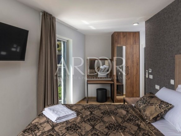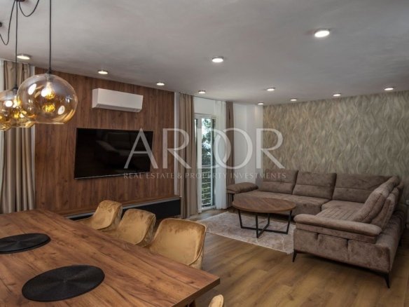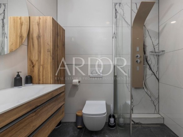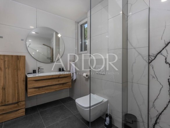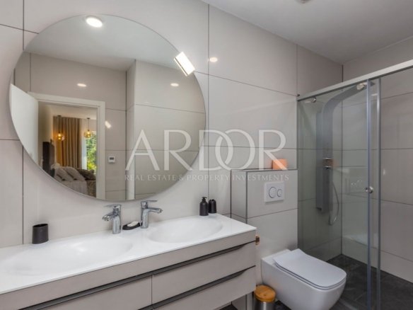 V naši ponudbi imamo novozgrajen dvojček – vilo s površino 201 m2, v neposredni bližini Mošćeničke Drage. Ta vila je del kompleksa, sestavljenega iz skupno treh vil. Hiša je v treh etažah: klet, pritličje in nadstropje. V kletnih prostorih je prostor za sprostitev in zabavo – dobro počutje ter strojnica za gospodinjske potrebe in kopalnica. Pritličje je rezervirano za dnevno sobo, kuhinjo, jedilnico in še eno kopalnico. Notranje stopnišče vodi v prvo nadstropje, kjer so tri prostorne spalnice, vsaka s svojo kopalnico. Hiša poleg notranjosti ponuja tudi lepo urejen vrt s 36 m² velikim bazenom. Zaradi ugodne lege se s terase ponuja izjemen pogled na morje in čudovit borov gozd. Pri gradnji te vile je bila vrednost postavljena na visok standard kakovosti, ki zagotavlja udobno in luksuzno bivanje. Hiša je v celoti urejena in opremljena ter opremljena s sodobnim video nadzornim sistemom. Vila ima talno ogrevanje s sistemom Daikin in klimatsko napravo v vseh prostorih. Ta nepremičnina se prodaja v celoti opremljena, tako da se lahko takoj vselite in uživate v svojem novem domu.