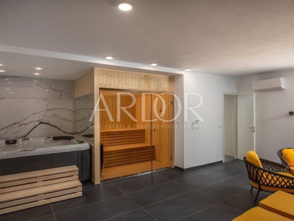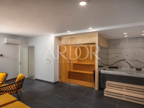 We have in our offer a newly built semi-detached house – a villa with an area of 201 m2, located in the immediate vicinity of Mošćenička Draga. This villa is part of a complex that includes a total of three villas. The house is spread over three floors: basement, ground floor and first floor. In the basement there is a space for relaxation and enjoyment – wellness, as well as a machine room for the needs of the house and one toilet. The ground floor is reserved for the living room, kitchen, dining room and another bathroom. An internal staircase leads to the first floor where there are three spacious bedrooms, each with its own bathroom. In addition to the interior space, the house also offers a beautifully landscaped garden with a 36m2 swimming pool. Due to its favorable location, the terrace offers an extraordinary view of the sea and the beautiful pine forest. This villa was built with an emphasis on a high standard of quality, which guarantees a comfortable and luxurious life. The house is fully decorated and furnished, and equipped with a modern video surveillance security system. The villa has underfloor heating that uses the Daikin system and air conditioners in all rooms. This property is being sold fully furnished, meaning you will be able to move in and start enjoying your new home straight away.