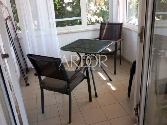 Sastoji se od hodnika, kupaonice, dnevnog boravka s kuhinjom u otvorenom prostoru te odvojene spavaće sobe. Dnevni boravak se nastavlja na zatvorenu lođu s pogledom na zelenilo, a s jedne strane lođe pruža se i pogled na more. Apartman je potpuno uređen, nema potrebe za dodatnim ulaganjima, a sigurnost osiguravaju protuprovalna ulazna vrata.