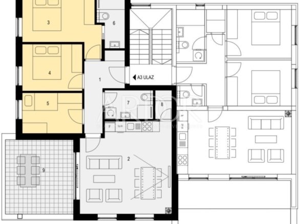 Apartma A3 se nahaja v 2. nadstropju in je sestavljen iz: hodnika, kuhinje/jedilnice/dnevne sobe, spalnice 1, spalnice 2, spalnice 3, kopalnice 1, kopalnice 2, shrambe, pokrite terase, parkirnega mesta 1, parkirnega mesta 2