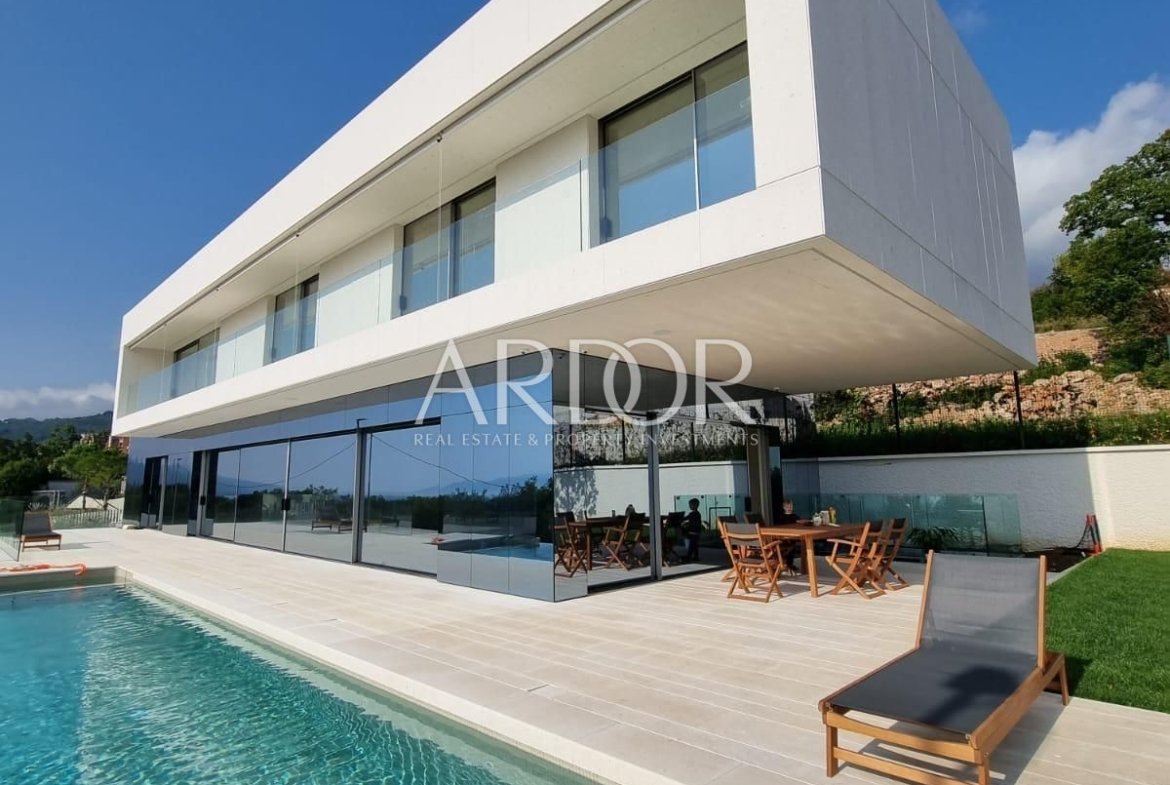 Questa villa moderna offre un totale di 380 m² di terrazze, una piscina a sfioro di 45 m² e vegetazione esotica all'interno del giardino privato, rendendola unica sulla Riviera di Opatija. L'interno è ulteriormente arricchito da atrii e spazi esterni incassati nel seminterrato, che sono collegati alla palestra e alla sauna.