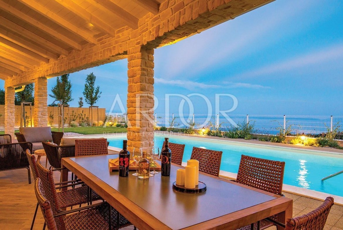 On two luxuriously equipped floors of approximately 400 m2, there are 5 bedrooms with private wardrobes, 5 bathrooms, spacious living room with kitchen and dining area, gym and sauna. The ground floor occupies an open space living room and dining room suitable for socializing, where in the central part there is a large table for ten people and a wood burning fireplace. Large glass openings connect the entire ground floor with terraces and sunbathing areas, and a heated pool measuring 12x6 m.