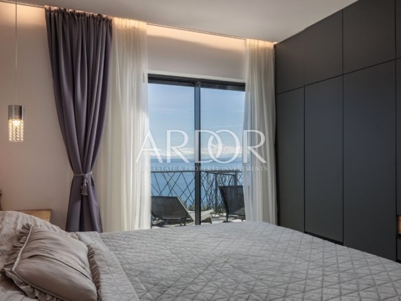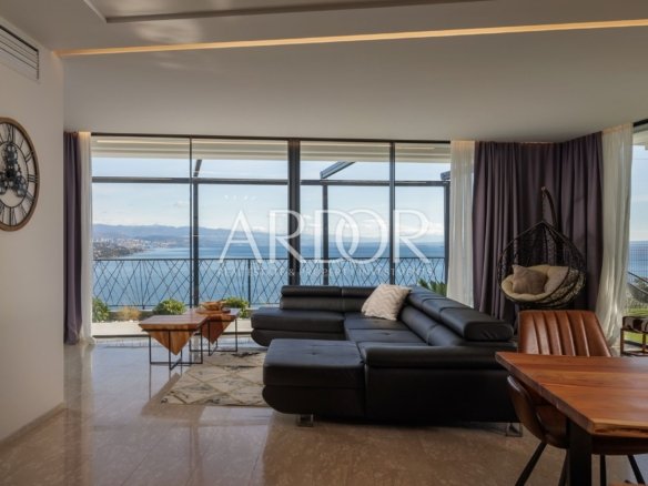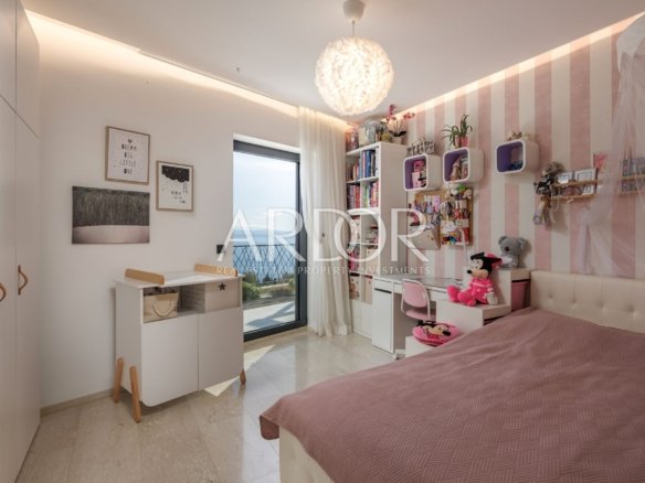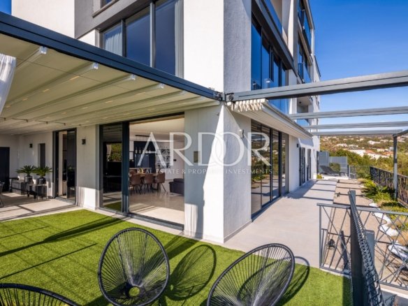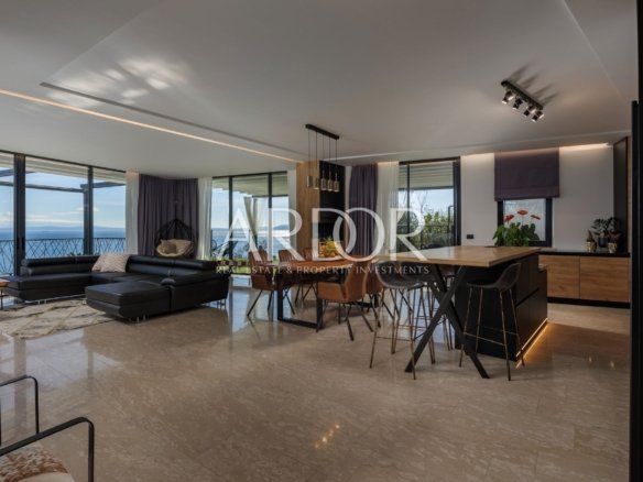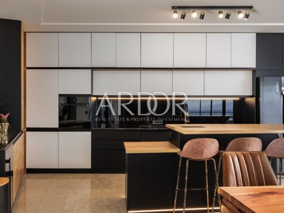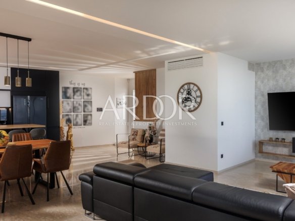Stan se sastoji od četiri sobe, tri kupaonice, od kojih je jedna u sklopu master sobe, vešeraja, radne sobe s wine-barom, strojarnice te velikog dnevnog boravka s blagovaonicom i kuhinjom. Blagovaonica i dnevni boravak imaju direktan izlaz na natkrivenu terasu s vanjskim stolom i ljetnom kuhinjom s roštiljem. Vanjski dio s terasom natkriven je s tri automatizirane pergo tende ukupne površine 80 m².