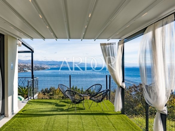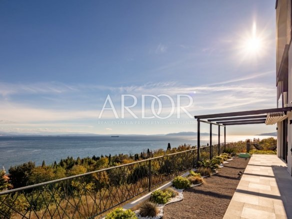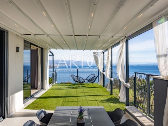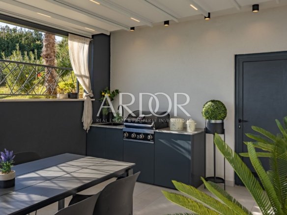 Stanovanje obsega štiri sobe, tri kopalnice (ena je del glavne spalnice), pralnico, delovno sobo z vinoteko, tehnični prostor ter velik dnevni prostor s kuhinjo in jedilnico. Jedilnica in dnevna soba imata direkten izhod na pokrito teraso z zunanjim jedilnim prostorom in letno kuhinjo z žarom. Zunanji del s teraso je pokrit s tremi avtomatiziranimi pergolami skupne površine 80 m².