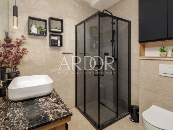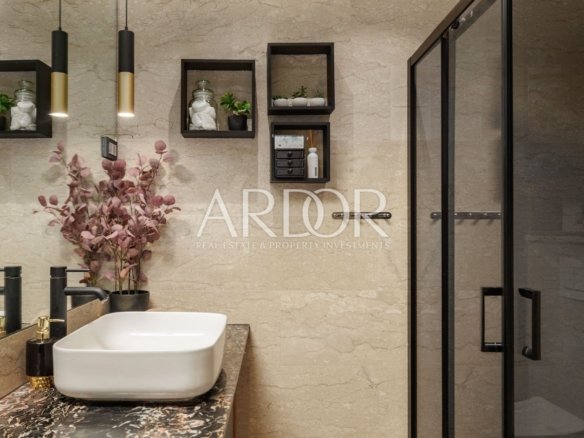 U 230 m² stana kao podna i zidna obloga postavljen je prvoklasni talijanski kamen Royal, dok su kuhinjska radna ploča i kupaonice obložene kamenom Nero Portoro. U preostalih 64 m² suterenskog dijela korištena je visokokvalitetna talijanska keramika, a svi ti prostori također imaju podno grijanje na dizalicu topline.