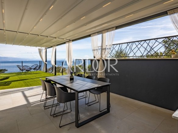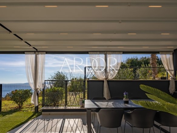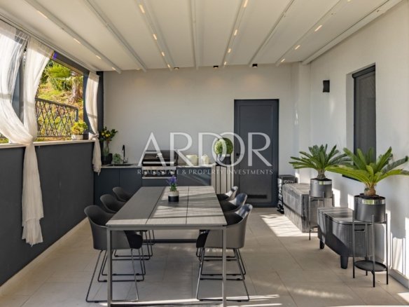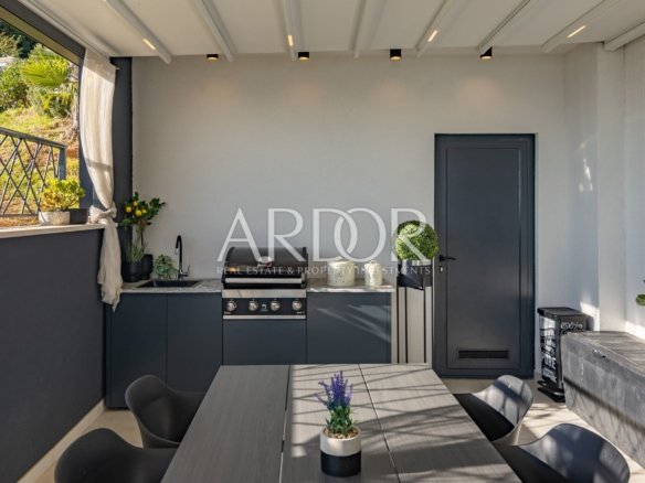 The apartment consists of four bedrooms, three bathrooms (one of which is en-suite in the master bedroom), a laundry room, an office with a wine bar, a utility room, and a large open-plan living room with a dining area and kitchen. The dining room and living area have direct access to a covered terrace with an outdoor dining table and a summer kitchen with barbecue. The outdoor terrace area is covered with three automated pergola awnings with a total surface of 80 m².