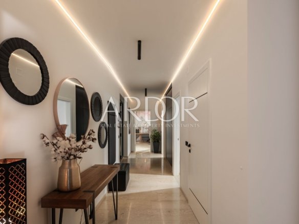 The entire property, including the basement, is equipped with underfloor heating powered by a heat pump, which also heats domestic hot water. All rooms are fitted with air-conditioning units and a smart management system via wall-mounted wired LED panels, while the underfloor heating is controlled by smart touch thermostats connected to a Smart Home application. The apartment also features an alarm system and video surveillance covering the entire exterior.