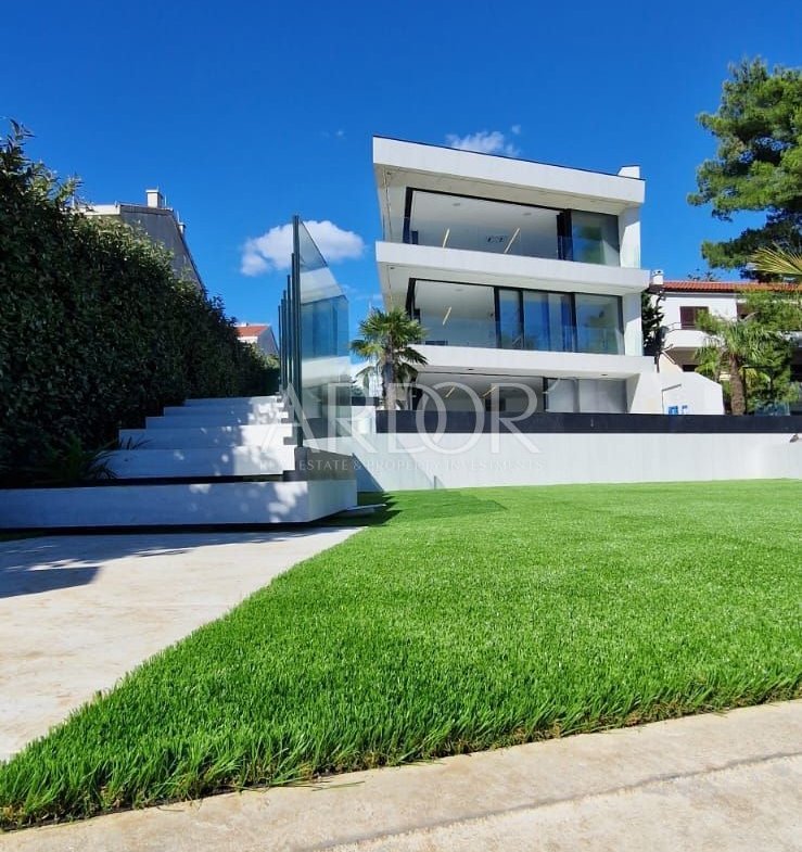 Questa casa privata ha tre piani e ogni piano è un appartamento separato per sé. Il piano terra ha un totale di 100 m2 ed è composto da due camere da letto, due bagni e servizi igienici, e nella parte anteriore si trovano la cucina, la sala da pranzo e il soggiorno con un'incredibile vista sul mare e sulle isole. Nell'ambito del piano terra è presente anche una grande piscina di 10x6/60 posta sul terrazzo. Il primo e il secondo piano misurano 150 mq e sono composti da tre camere da letto, tre bagni e servizi igienici, e come il piano terra si trovano la cucina, la sala da pranzo e il soggiorno con una vista incantevole. La casa dispone di ascensore e bellissime pareti di vetro su ogni piano. Il terreno è di 800 m2.La villa è attrezzata e arredata con i migliori materiali di altissima qualità. L'attrezzatura è falegnameria in alluminio Vicona, vetro a 3 strati riempito con argon, il sistema di riscaldamento e raffreddamento avviene tramite il sistema di riscaldamento a pavimento Daikin nei soggiorni e nei bagni più aria condizionata. Climatizzatori Daikin Emura. Sistema appartamento intelligente: controllo remoto tramite telefono cellulare. Facciata in travertino più facciata autoventilata nera. Sono in fase di realizzazione illuminazione Zumtobell, ceramica Imola 1° classe 120/60, 120/120 e predisposizione per pannelli solari. Immobili di prima qualità in una posizione attraente, una rarità sul mercato!