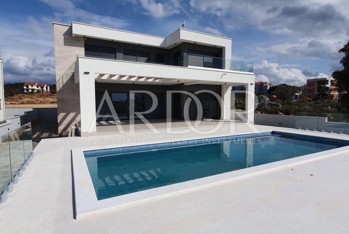 Prodaje se samostojeća villa, na ekskluzivnoj lokaciji, udaljena od plaže cca 250m, sa pogledom na more. Sastoji se od prostranog dnevnog boravka s kuhinjom i blagovaonice sa izlazom na terasu, bazenom i sunčalištem, četiri spavaće sobe s velikim kliznim prozorima u XXL formatu, sa pripadajućim kupaonicama, ostave i zasebnog WC-a. Kuća ima pripremu za otvoreni kamin u dnevnom boravku, plutajuće stubište popločano mramorom te su pri gradnji korišteni vrhunski materijali.