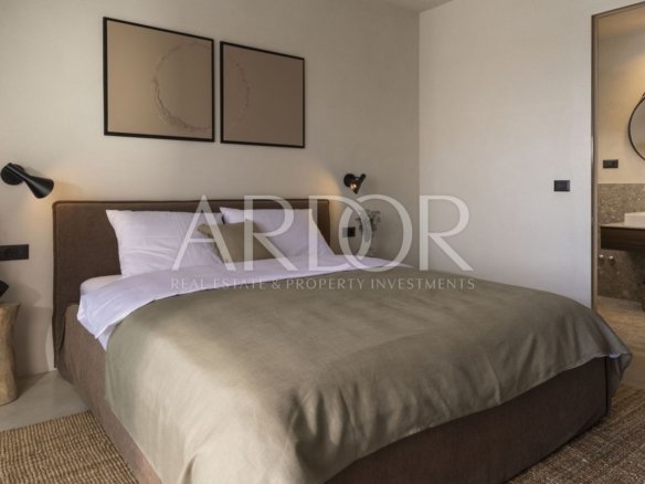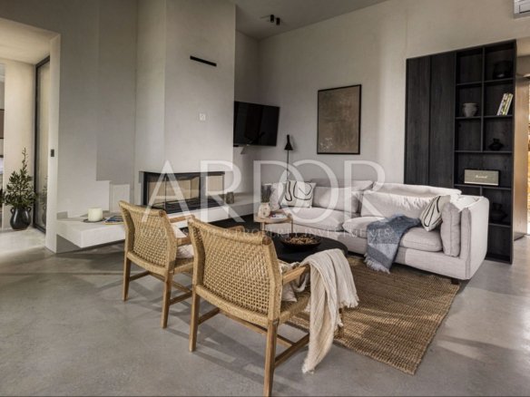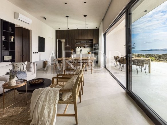 The villa is equipped with a fully fitted kitchen, bathrooms with walk-in showers, and underfloor heating and air conditioning in all rooms. It also includes an outdoor lounge and a terrace with a barbecue. The villa features a photovoltaic system that provides additional energy for the property.