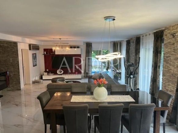 Pogled se prostire na okolno zelenilo, bazen i teniski teren. Prodaje se kompletno namještena.