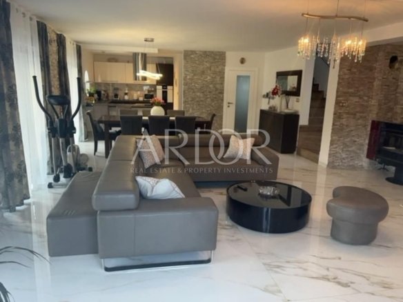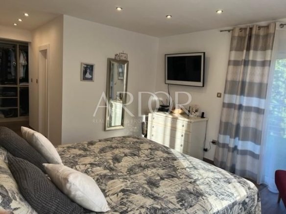 Pogled seže na okoliško zelenje, bazen in teniško igrišče. Prodaja se v celoti opremljena.