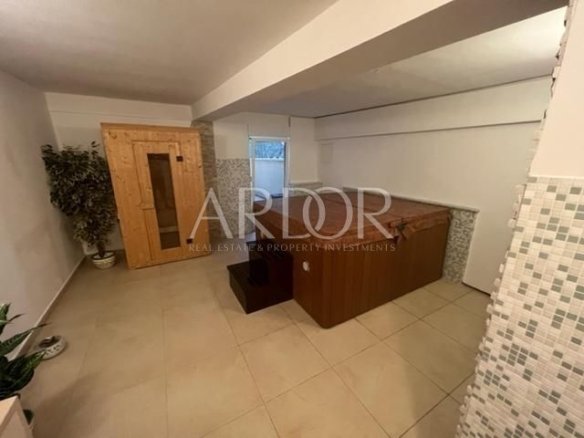 U prizemlju se nalazi garaža od 105m2, natkriveni prolaz od 3.11m2, stepenište u površini 2.64m2, te apartman, vešeraj, konoba s wc-om, jacuzzi, sauna, kotlovnica i ostava, a sve u površini 287.13m2.