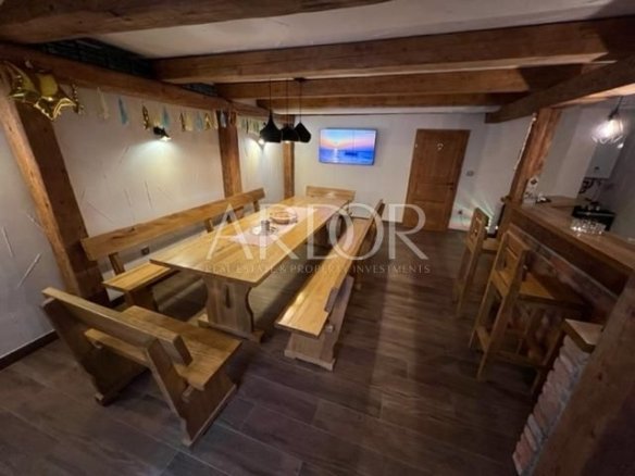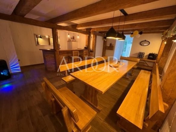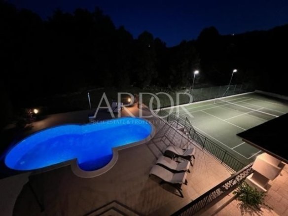 Na okućnici je smješten bazen sa sunčalištem, te se tik do bazena nalazi teniski teren, a iznad bazena se nalazi velika terasa na kojoj je smještena prelijepo uređena sjenica.
