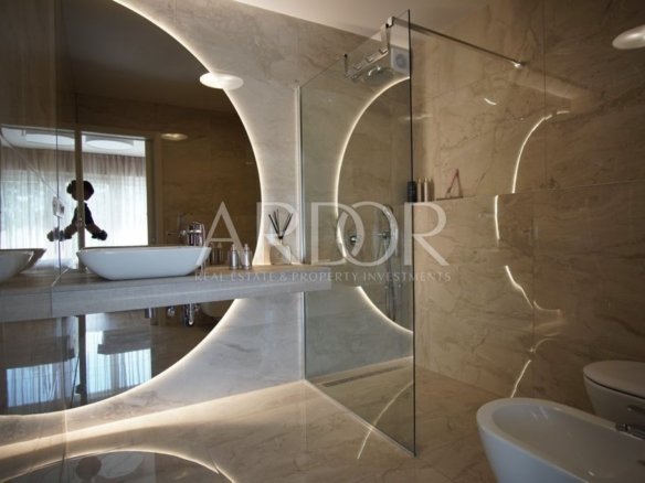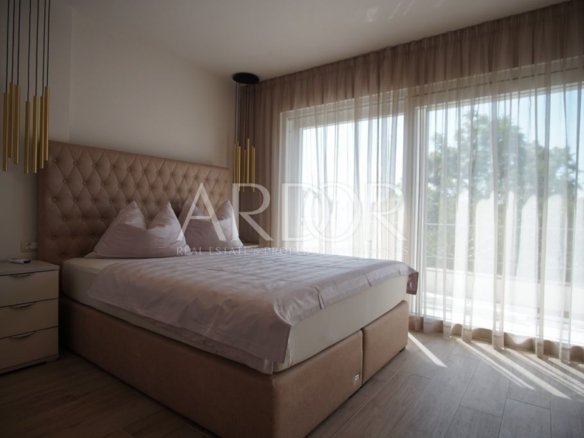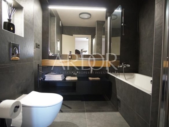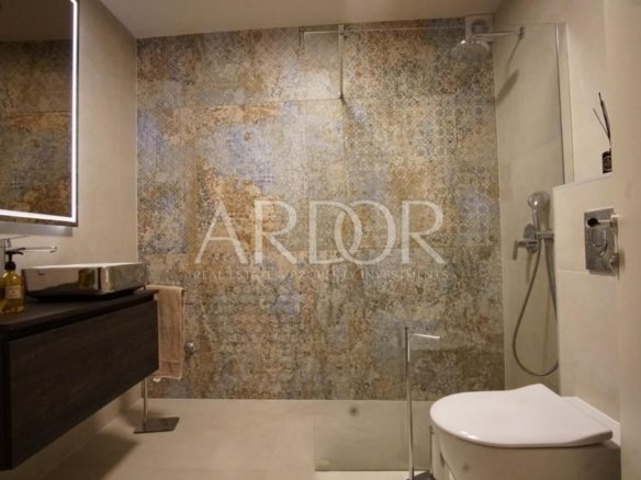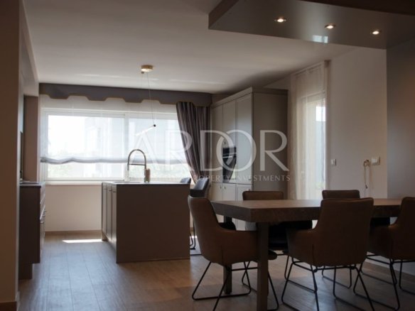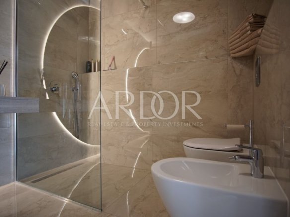 It consists of an entrance hall, open space consisting of a kitchen with dining area and living room, a total of three bedrooms, two of which are large with private bathroom with shower and bathtub. The third bedroom is slightly smaller and can be used as a guest room or children’s room. The apartment has a third bathroom, guest. Each bedroom has access to its own terrace. Heating is underfloor, each room is air conditioned.