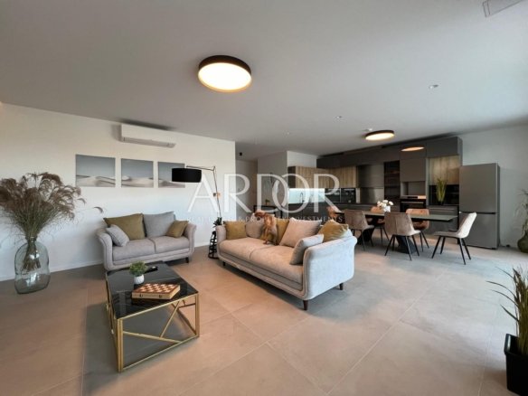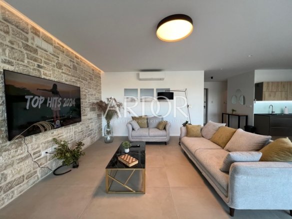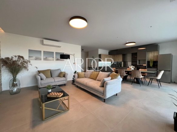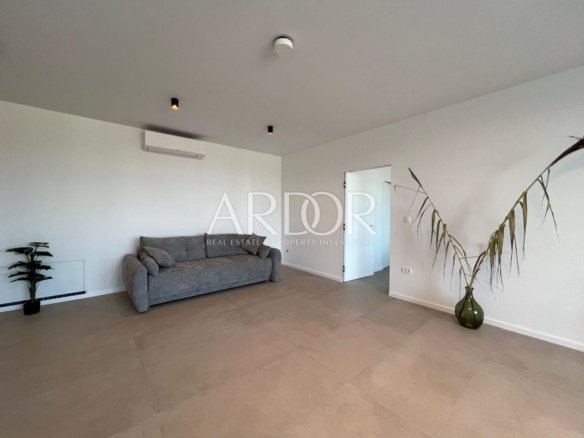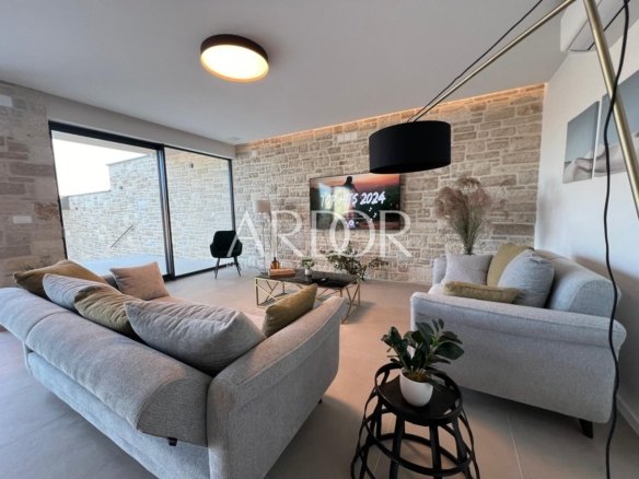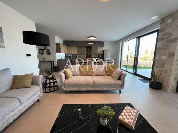 Prizemlje kuće čini prostrani otvoreni dnevni boravak, kuhinja i blagovaonica, s velikim staklenim površinama koje povezuju unutarnji prostor s vanjskim vrtom. Iz dnevnog boravka izlazi se u lijepo uređen vrt, gdje se nalazi bazen dimenzija 4×12 metara, savršen za opuštanje i druženja. Natkrivena ljetna kuhinja, opremljena za pripremu obroka na otvorenom, stvara idealno mjesto za uživanje u toplim večerima. Na prizemlju se također nalazi spavaća soba s vlastitom kupaonicom te praktičan gostinjski WC.