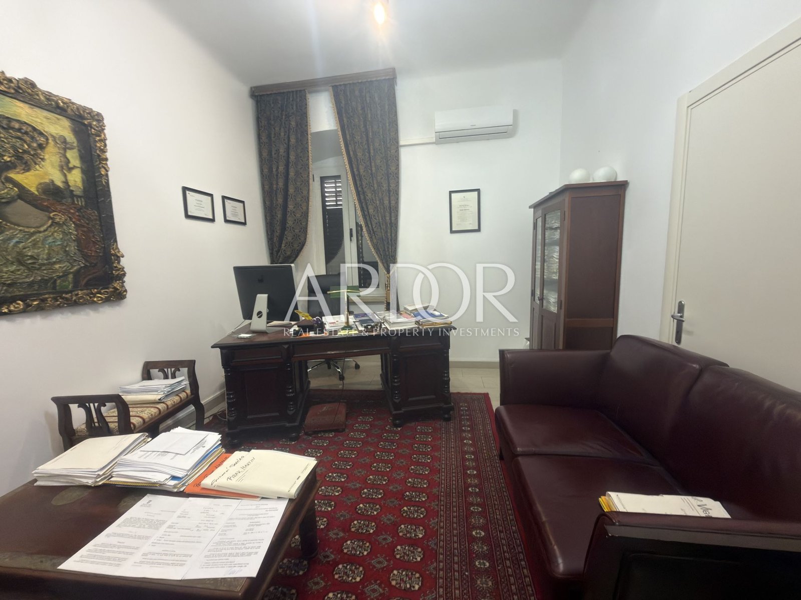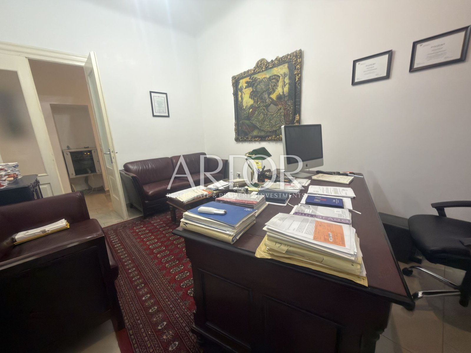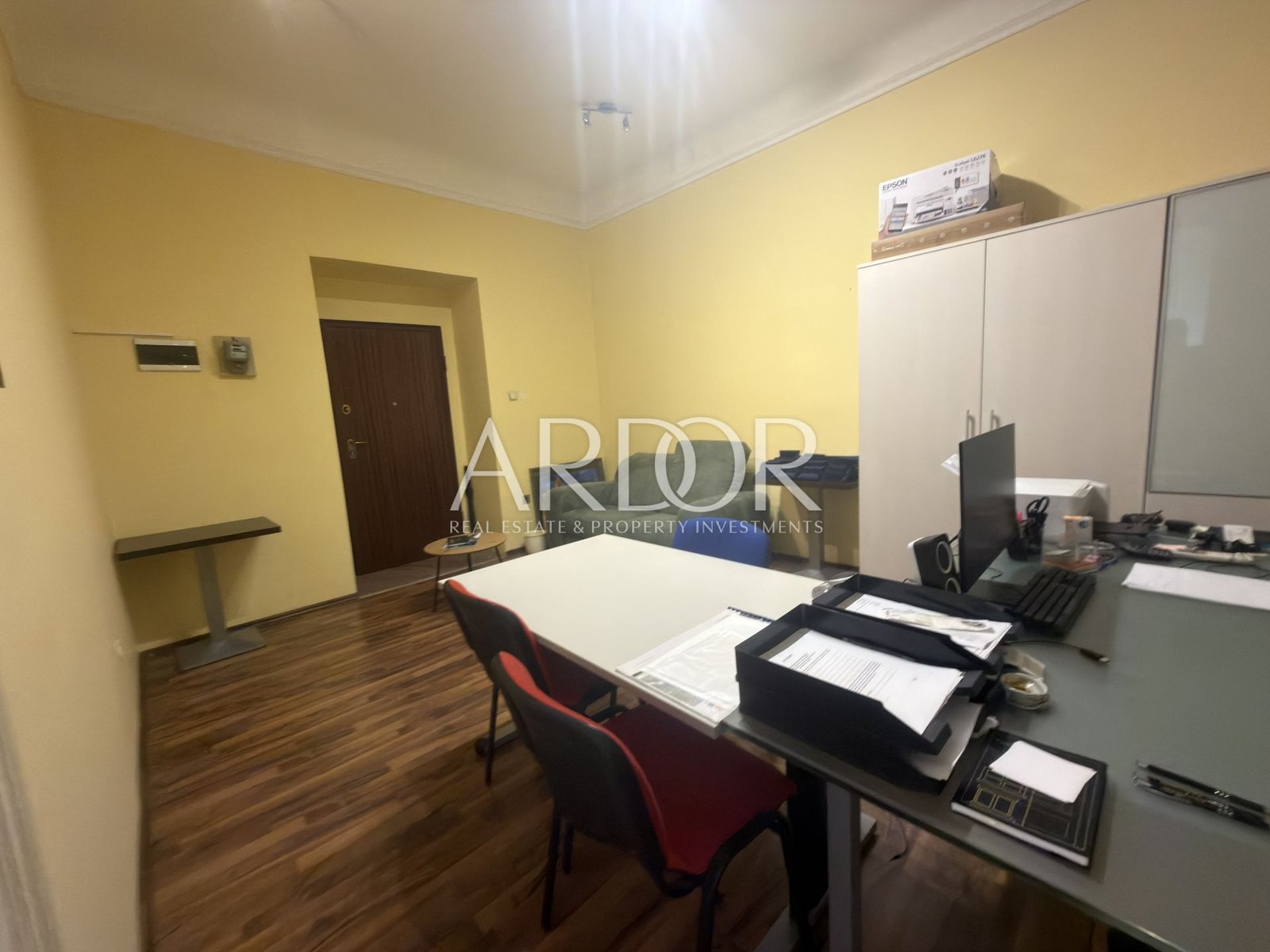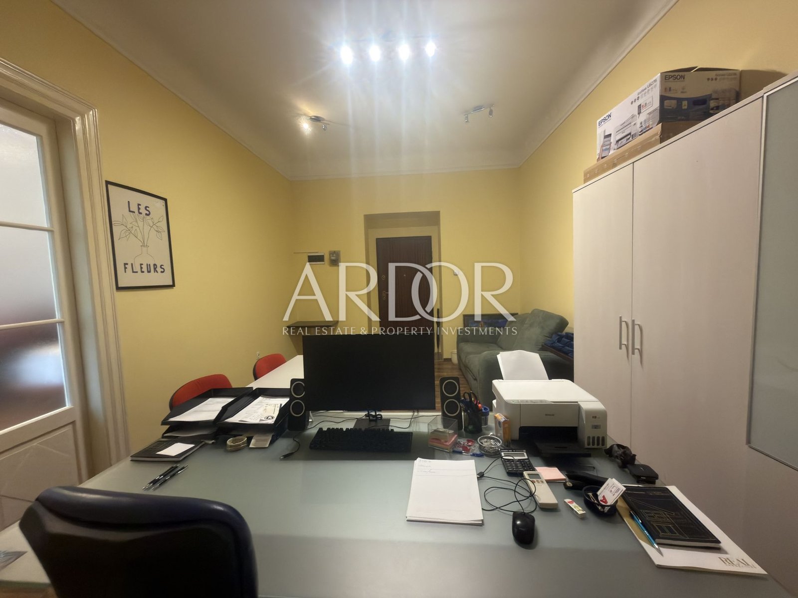 Lo spazio è funzionalmente suddiviso e comprende cinque ambienti separati, un servizio igienico e un balcone, consentendo un’organizzazione flessibile e l’adattamento a diverse esigenze lavorative.