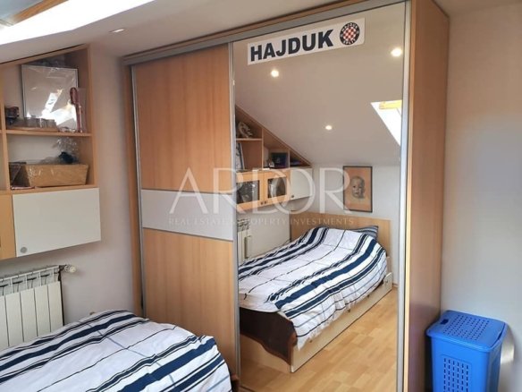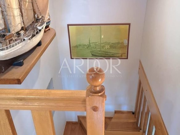 Sestavljen je iz 1 velike in 1 manjše dnevne sobe, kuhinje, 4 spalnic, 1 velike kopalnice in manjšega stranišča. V spodnji etaži se nahaja dnevna soba, kuhinja, ena spalnica in večja kopalnica, v zgornji etaži pa tri spalnice, manjša dnevna soba in manjši WC. Apartma nudi čudovit pogled na morje.