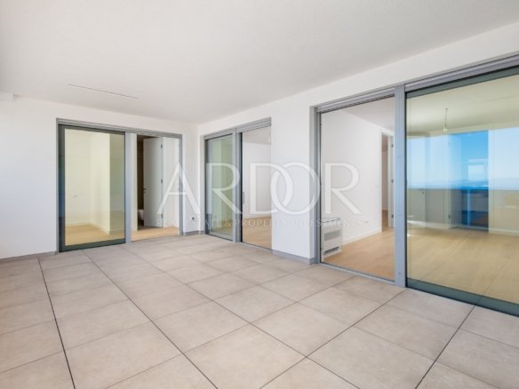 Das Innere umfasst zwei Schlafzimmer, jedes mit eigenem Bad und Dusche, ein zusätzliches Gästebad sowie ein geräumiges Wohnzimmer mit Küche und Essbereich. Dieser offene Raum ist nahtlos mit dem großen Balkon verbunden, perfekt um den Panoramablick auf das Meer zu genießen.