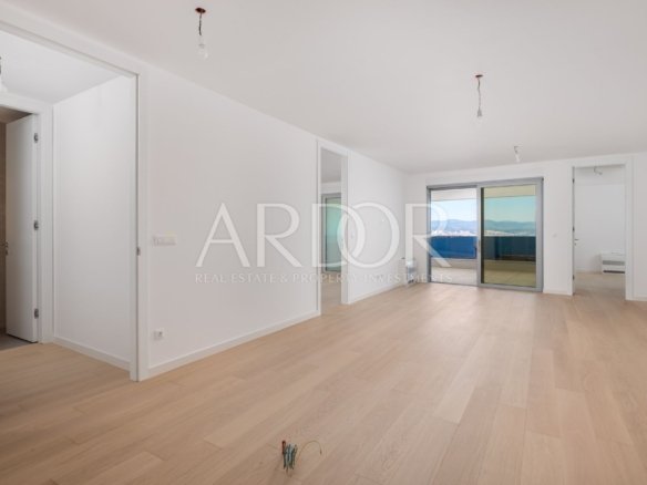 Unutrašnjost uključuje dvije spavaće sobe, svaka s vlastitom kupaonicom i tušem, dodatnu kupaonicu za goste, kao i prostrani dnevni boravak s kuhinjom i blagovaonicom. Ovaj otvoreni prostor savršeno je povezan s velikim balkonom, savršenim za uživanje u panoramskom pogledu na more.