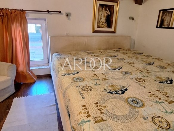 Prvi del stanovanja obsega dnevno sobo in kopalnico, drugi del, ki se nahaja v mansardi pa obsega dnevno sobo, kuhinjo, spalnico in drugo kopalnico.