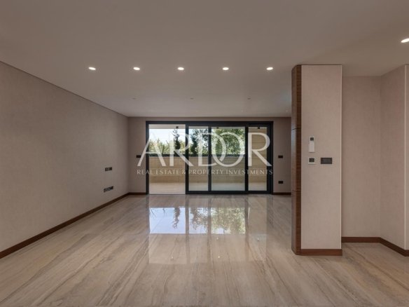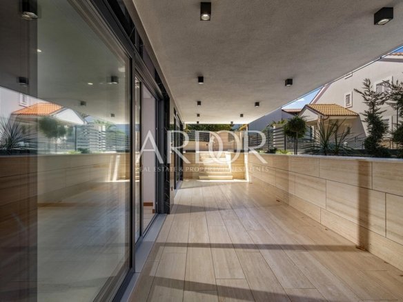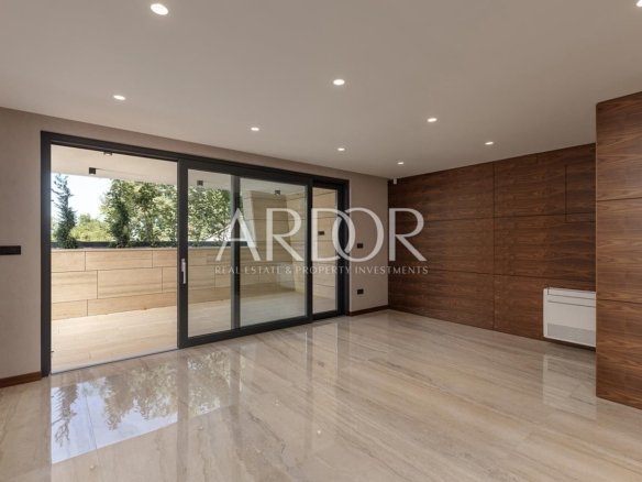 Stan u prizemlju nudi otvoreni koncept dnevnog boravka s kuhinjom i blagovaonicom, tri spavaće sobe, dvije kupaonice i jednu polukupaonicu. Također, stan ima terasu od 26 m² i vrt od 126 m² s vanjskim grijanim bazenom od 15 m².