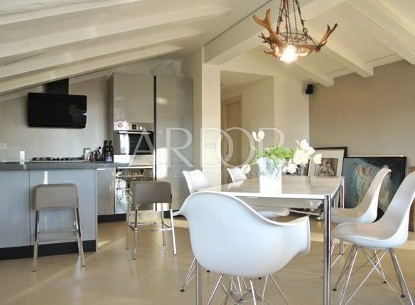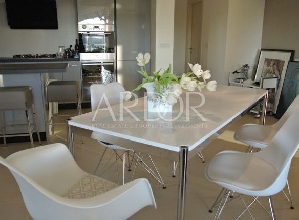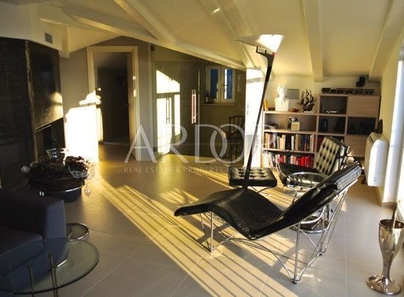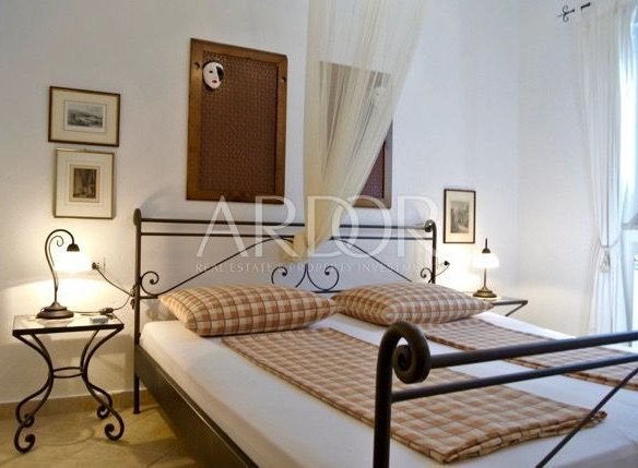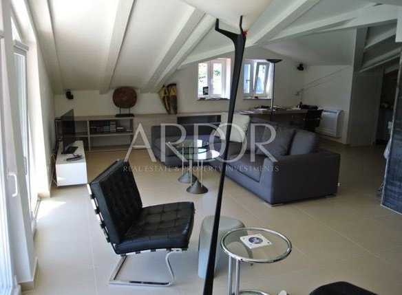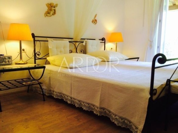 Na katu nalazi se glavni stan koji se sastoji od dnevnog boravka s kaminom, modernu kuhinju, te prostranu blagovaonicu. Dvije spavaće sobe i jedna kupaona.