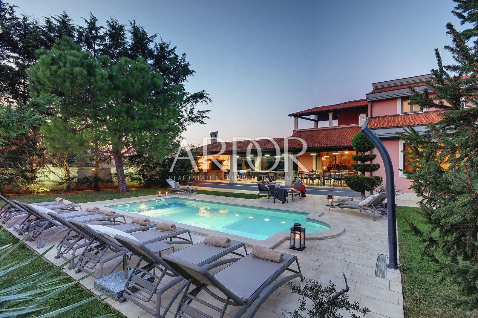 Ta luksuzna vila ponuja 350 m² notranjega prostora in stoji na parceli velikosti 800 m² z zasebnim bazenom. Popolnoma je opremljena in elegantno namještena, kar zagotavlja udobje in razkošje.