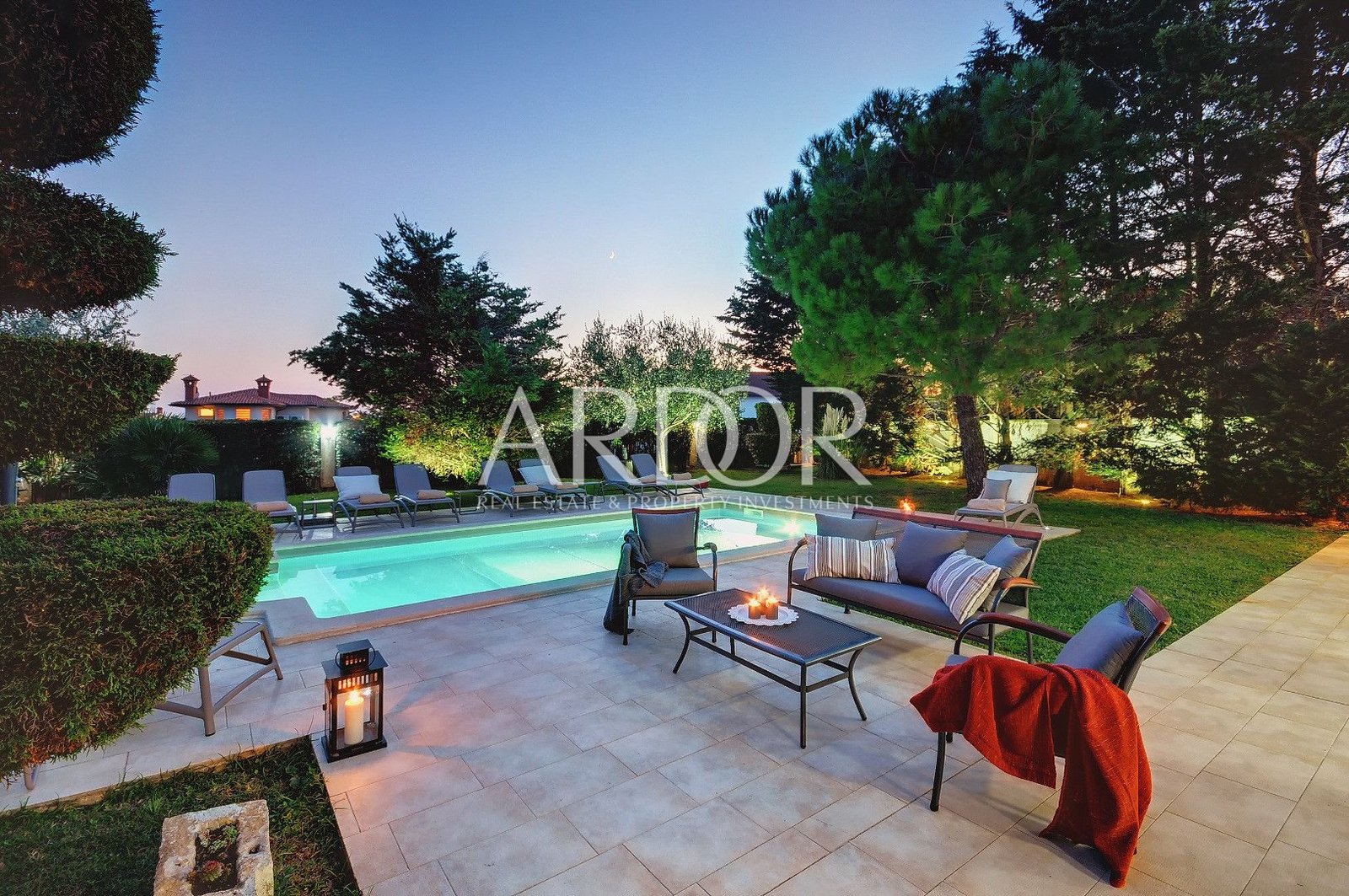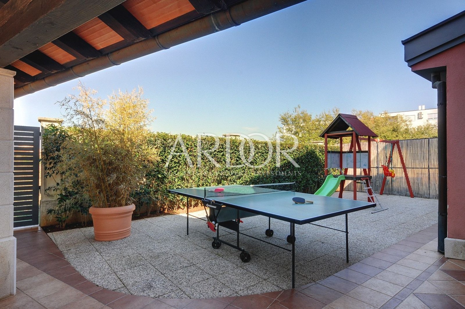 Veliki vrt s bazenom i igralište za djecu nalazi se na vanjskoj strani kuće. Na natkrivenoj terasi dostupni su vanjska kuhinja i roštilj. Na okućnici se nalazi biljar, stolni nogomet, stolni tenis i pikado, idealni za zabavu i druženje.