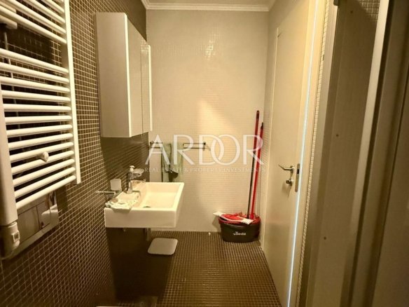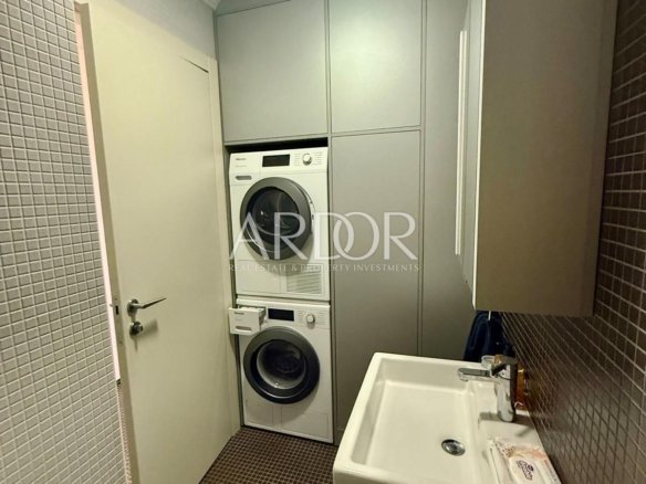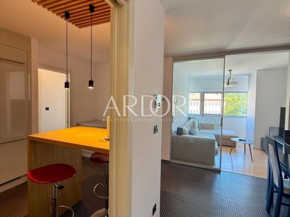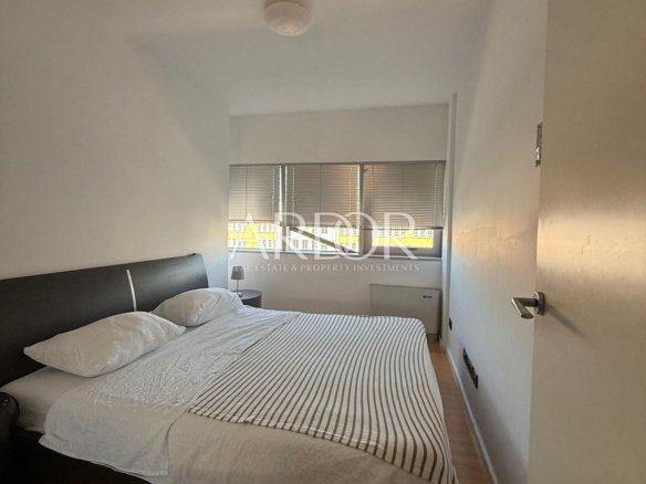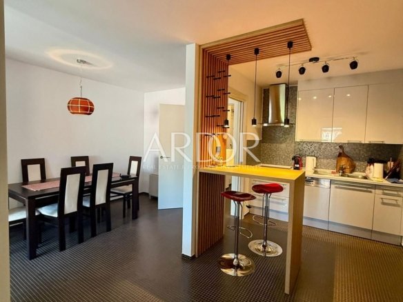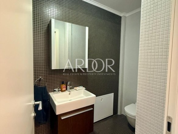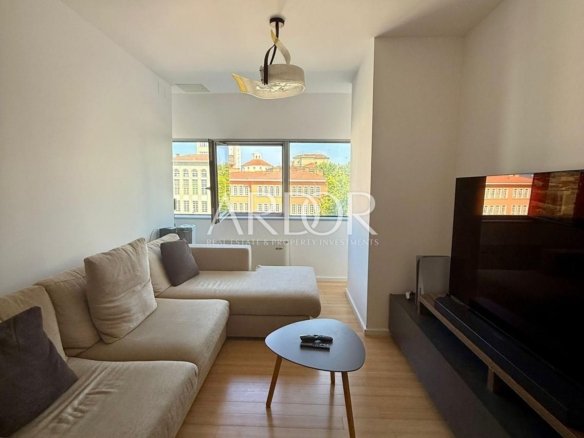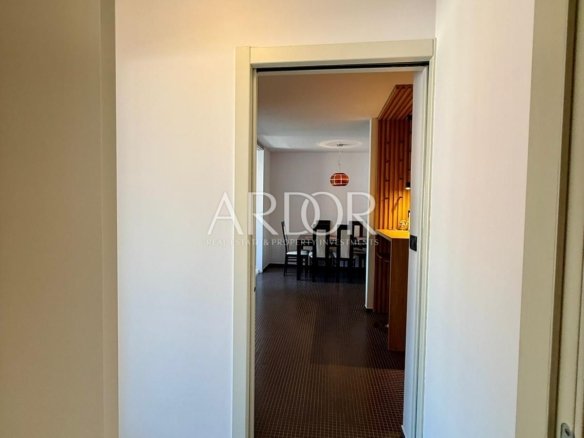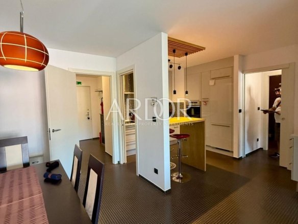 A fully equipped and furnished apartment of 65.52 m² is available for rent on the 4th floor of a very attractive smart building, just a few steps from all essential amenities. The apartment consists of an entrance hall, WC, kitchen with dining area, living room, two bedrooms, hallway, and bathroom. Additionally, it includes a private garage parking space and a 2.67 m² storage room in the basement. The underground garage is connected to the upper floors by an elevator. Utilities are not included in the rental price.