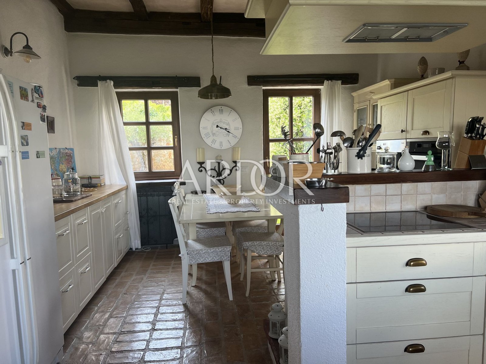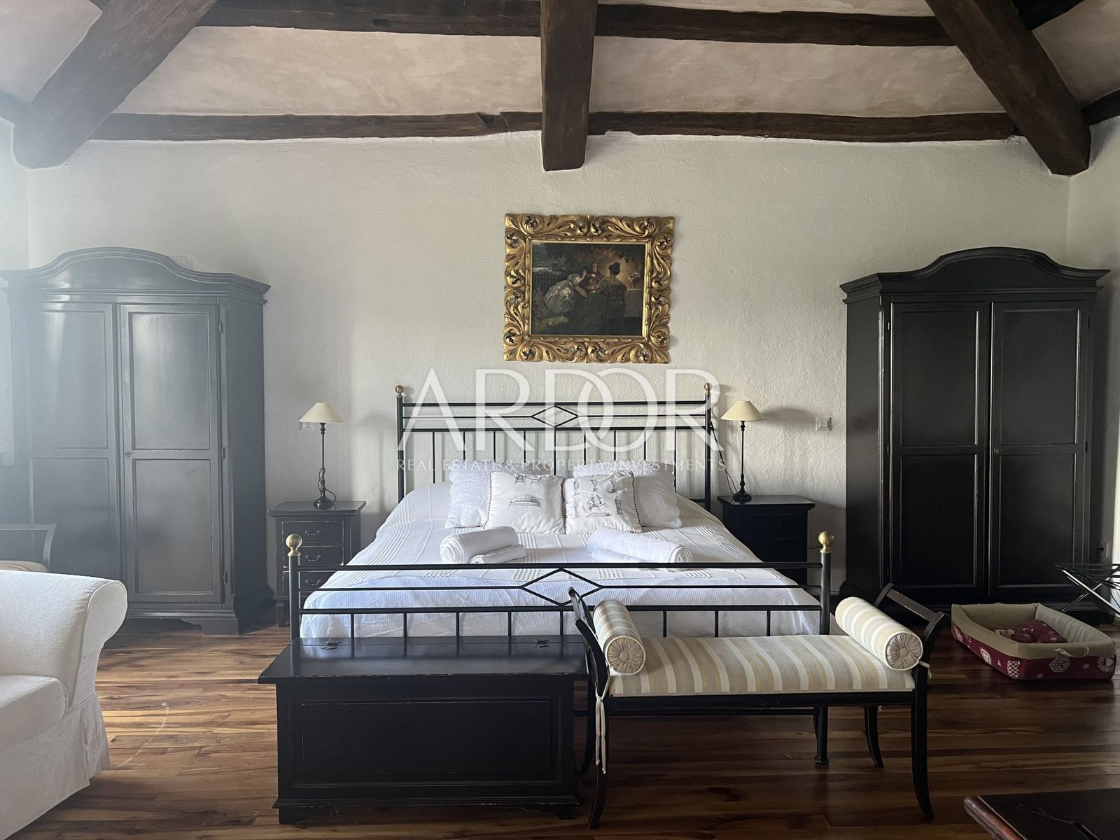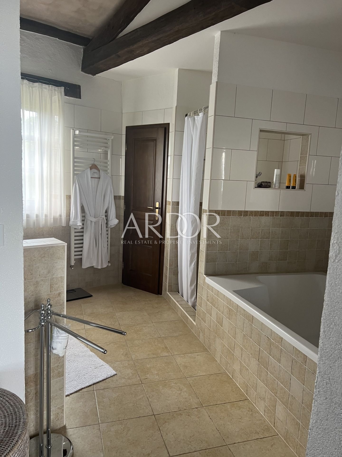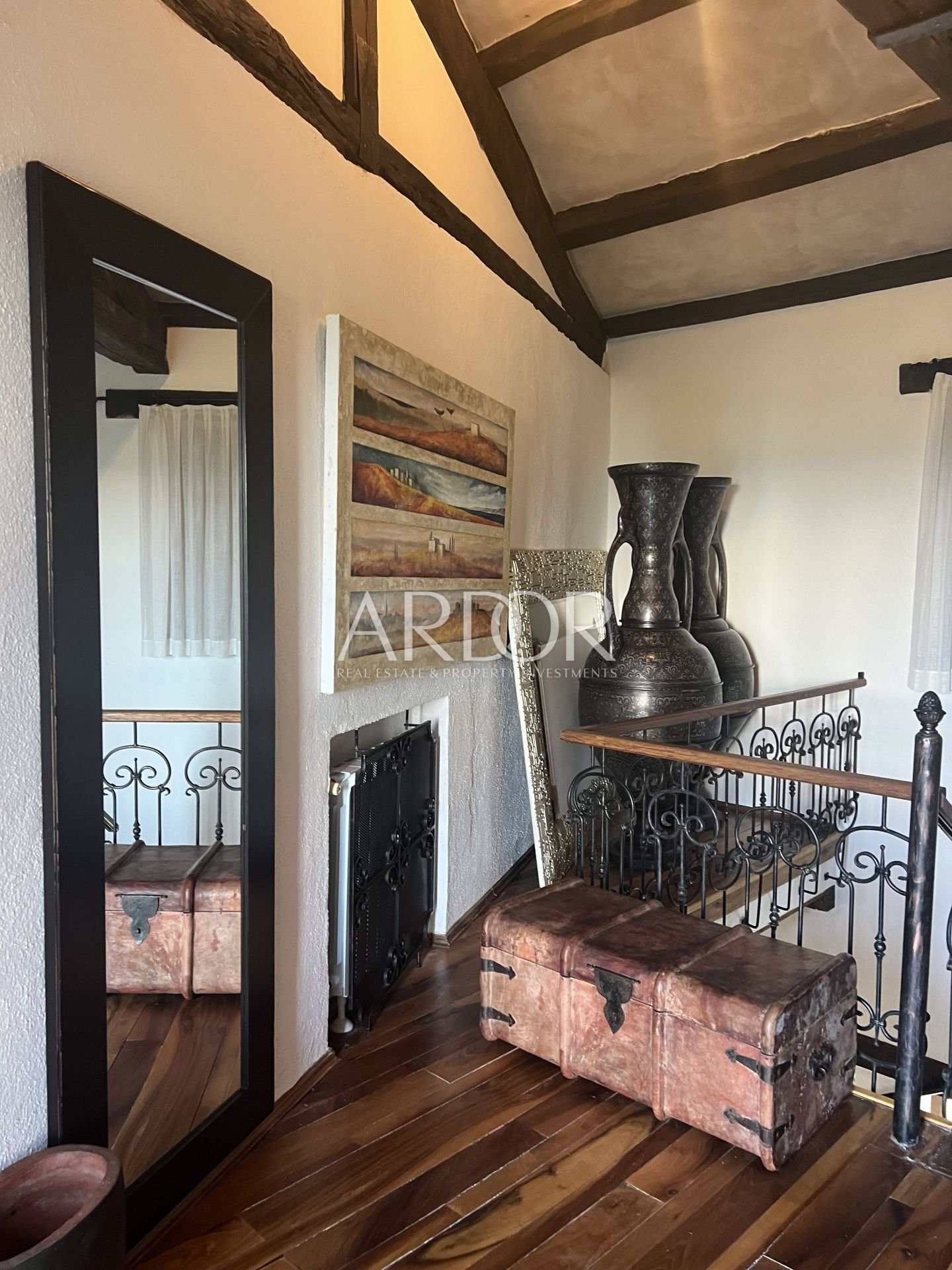 Internal stairs lead to the first floor, where there is an elegantly decorated and equipped study and a spacious bedroom with an open bathroom and a separate toilet. This master bedroom has a fireplace where you can enjoy the cold winter evenings and also an exit to the terrace with a wonderful view. The villa has a basement where there is a room for washing and drying clothes, a sauna and a shower cabin. We also have a luxuriously decorated wine shop where wine lovers can enjoy an intimate atmosphere and socializing. The mentioned rooms have access to the garden. For colder winter days, the house has built-in oil central heating and two fireplaces, and for hot summer days, air conditioners have been installed. The floors are covered with parquet and terracotta, which gives a special charm to the space and goes perfectly with wood and stone.