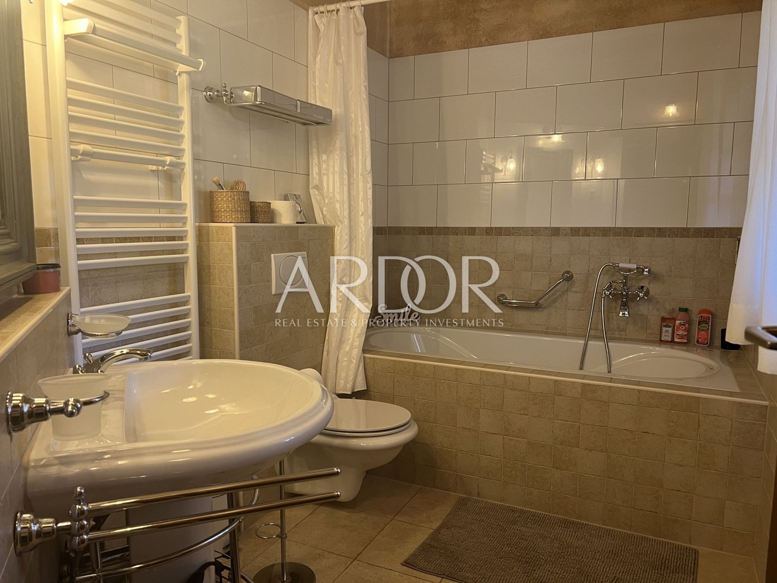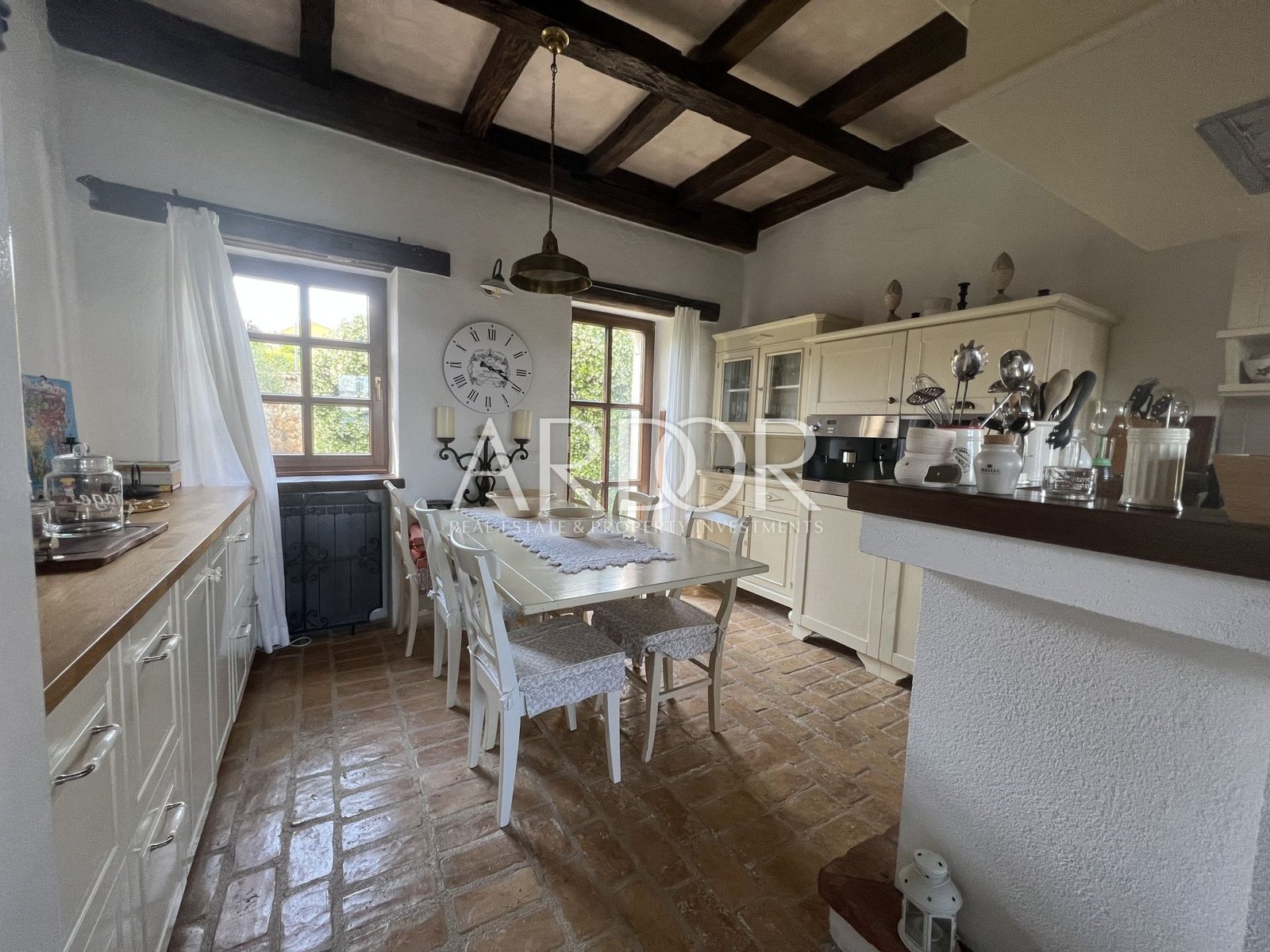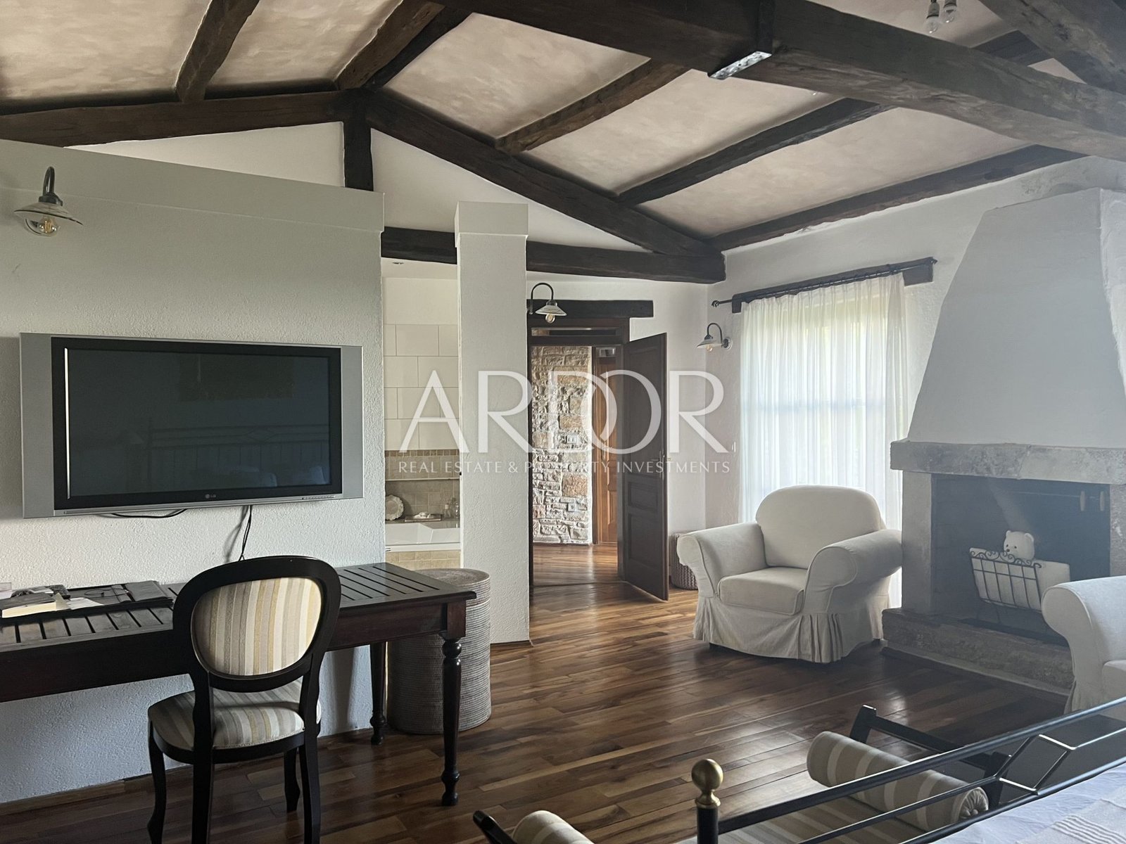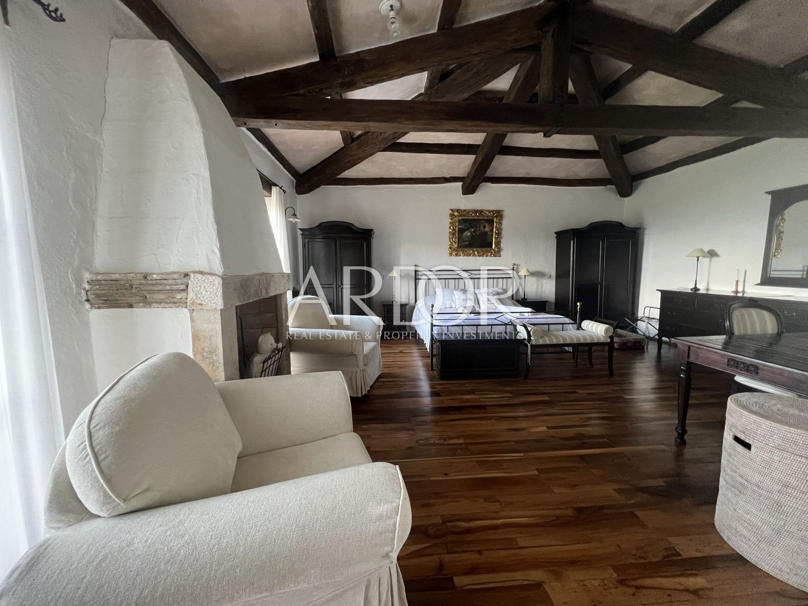 Internal stairs lead to the first floor, where there is an elegantly decorated and equipped study and a spacious bedroom with an open bathroom and a separate toilet. This master bedroom has a fireplace where you can enjoy the cold winter evenings and also an exit to the terrace with a wonderful view. The villa has a basement where there is a room for washing and drying clothes, a sauna and a shower cabin. We also have a luxuriously decorated wine shop where wine lovers can enjoy an intimate atmosphere and socializing. The mentioned rooms have access to the garden. For colder winter days, the house has built-in oil central heating and two fireplaces, and for hot summer days, air conditioners have been installed. The floors are covered with parquet and terracotta, which gives a special charm to the space and goes perfectly with wood and stone.