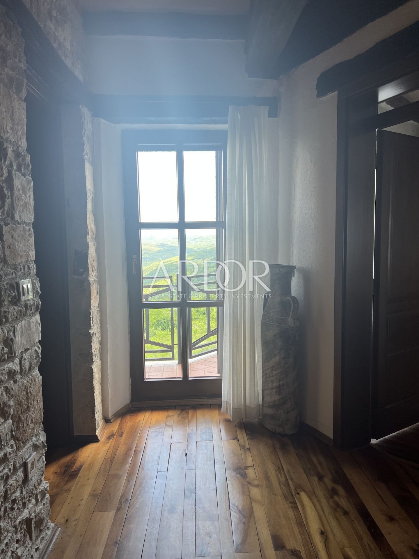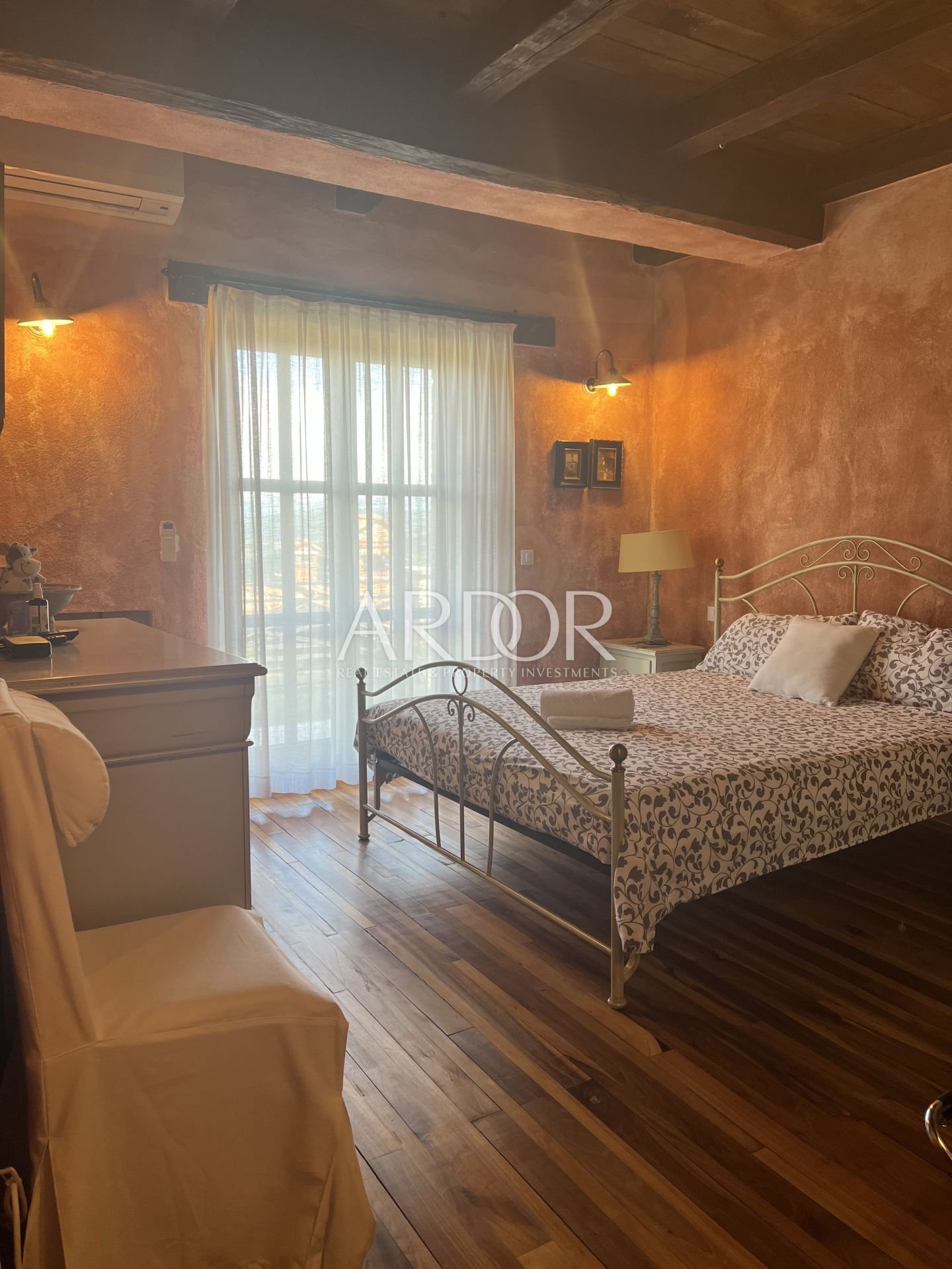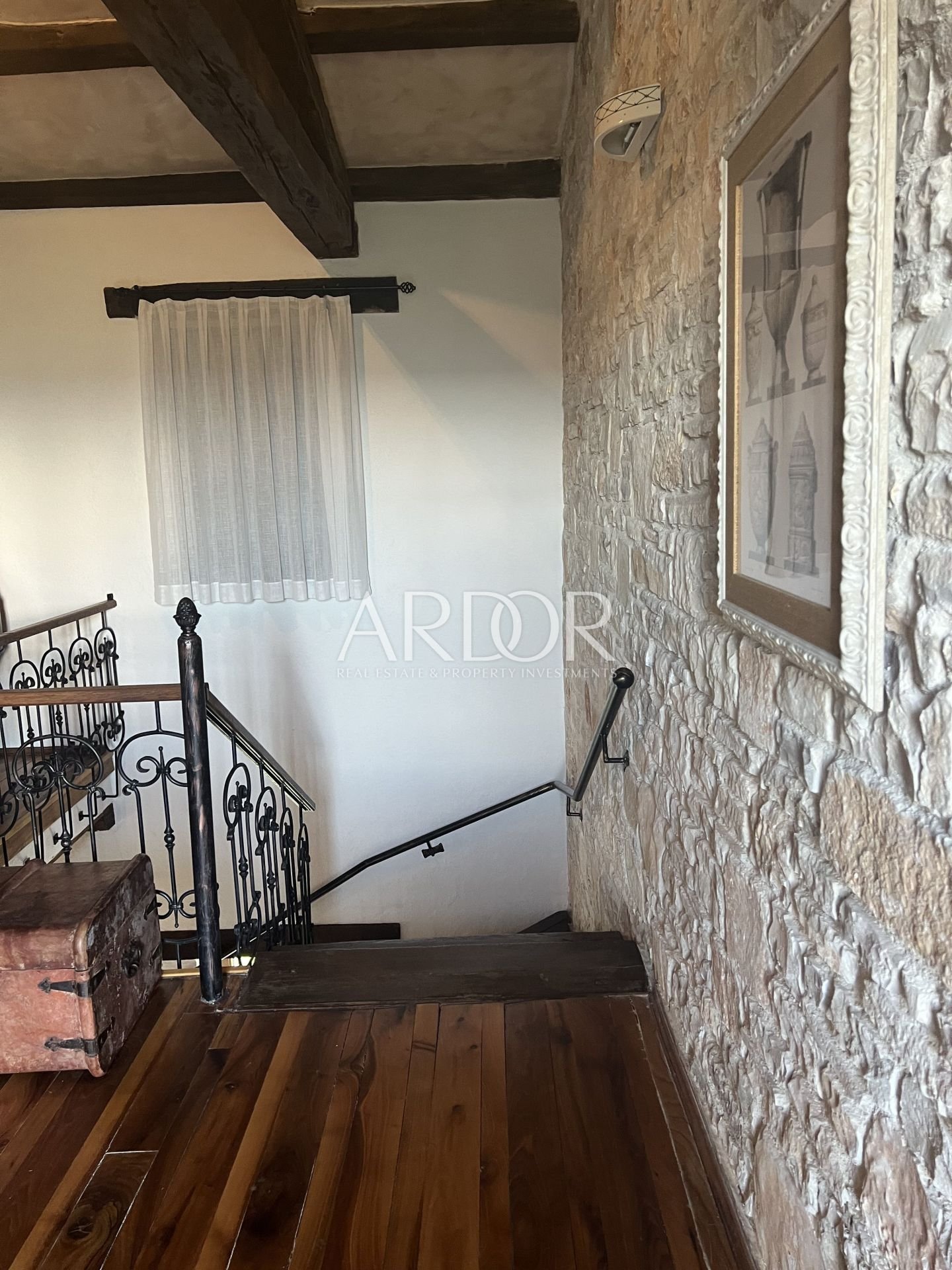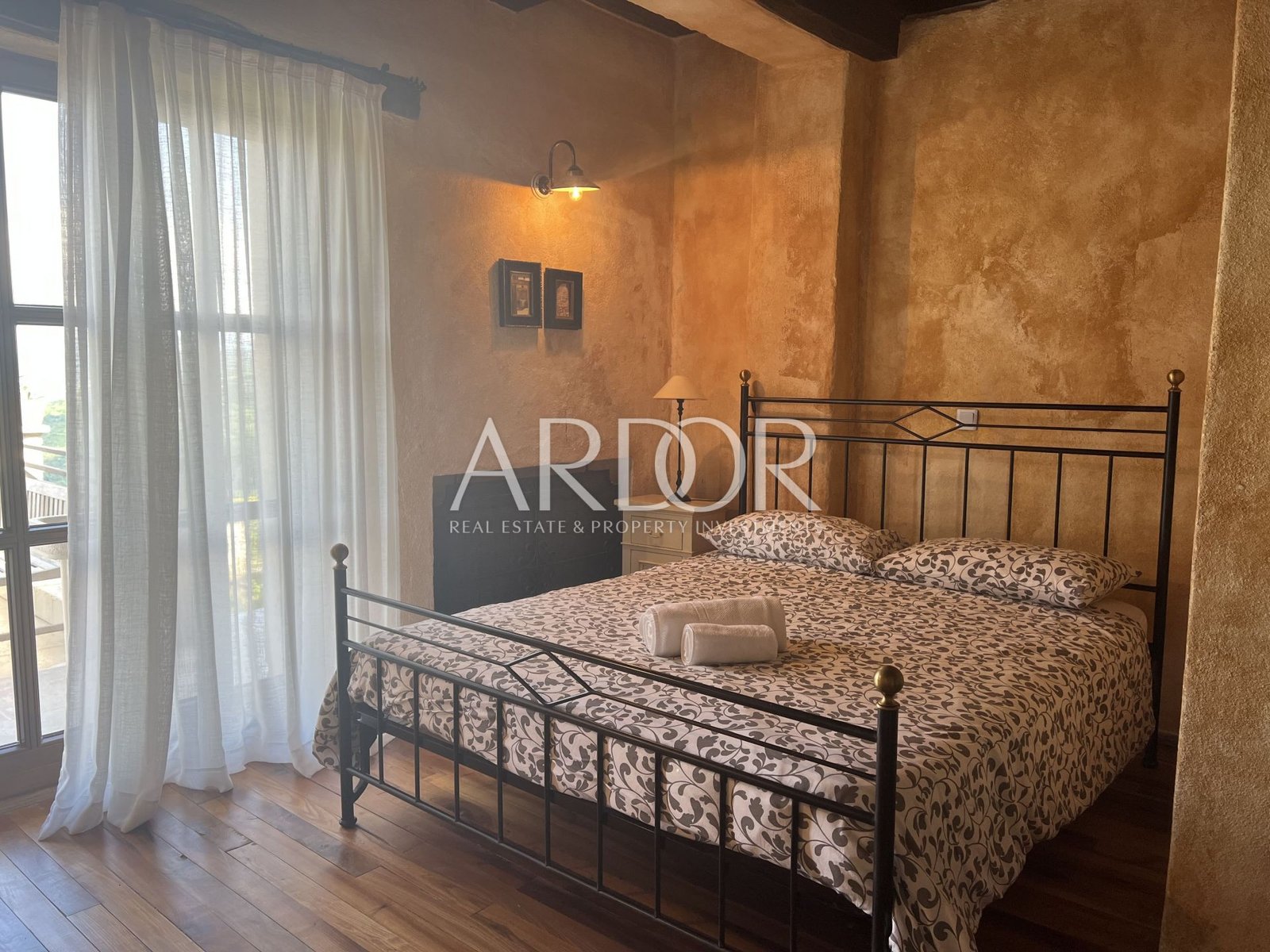 Internal stairs lead to the first floor, where there is an elegantly decorated and equipped study and a spacious bedroom with an open bathroom and a separate toilet. This master bedroom has a fireplace where you can enjoy the cold winter evenings and also an exit to the terrace with a wonderful view. The villa has a basement where there is a room for washing and drying clothes, a sauna and a shower cabin. We also have a luxuriously decorated wine shop where wine lovers can enjoy an intimate atmosphere and socializing. The mentioned rooms have access to the garden. For colder winter days, the house has built-in oil central heating and two fireplaces, and for hot summer days, air conditioners have been installed. The floors are covered with parquet and terracotta, which gives a special charm to the space and goes perfectly with wood and stone.
