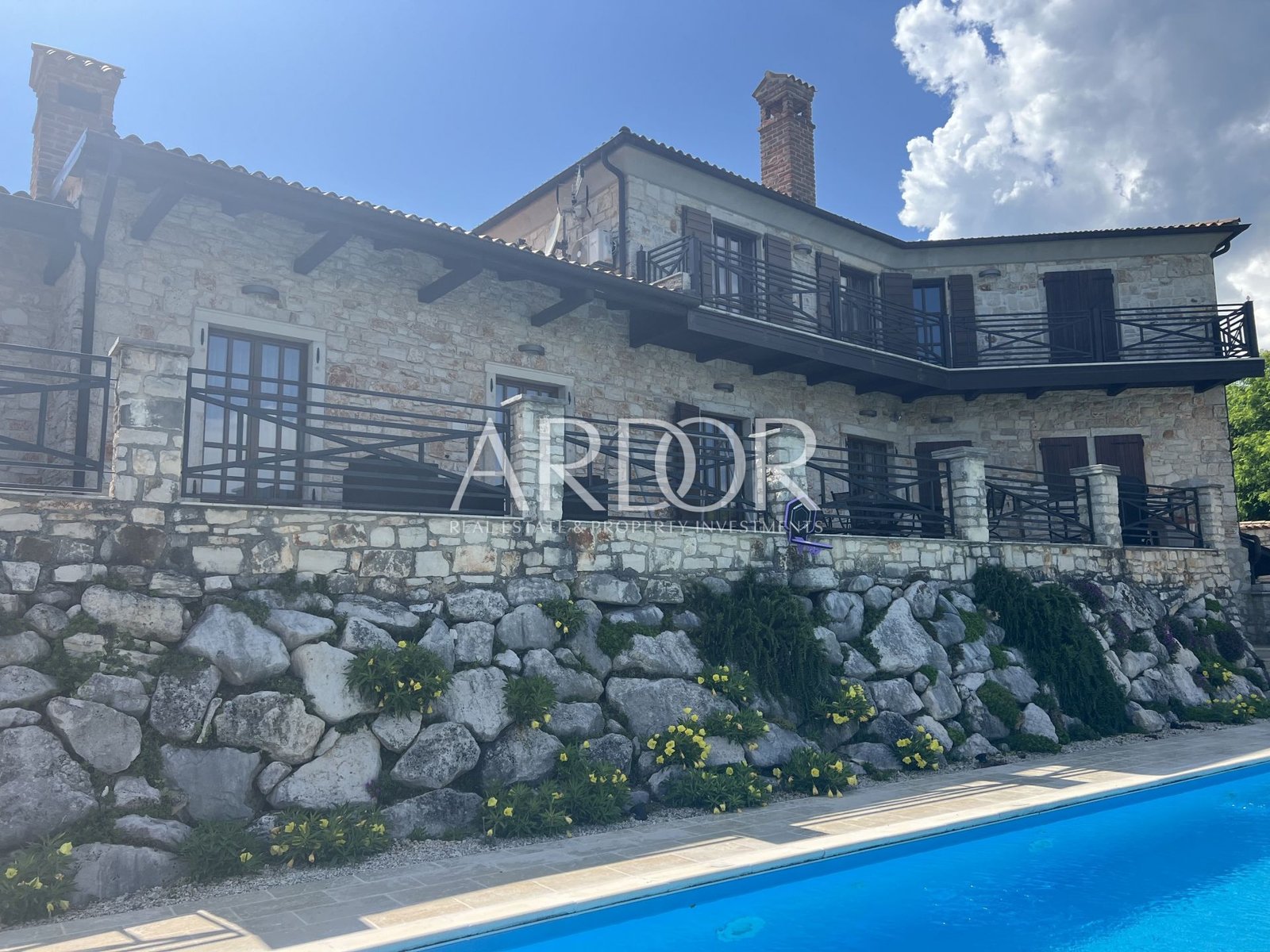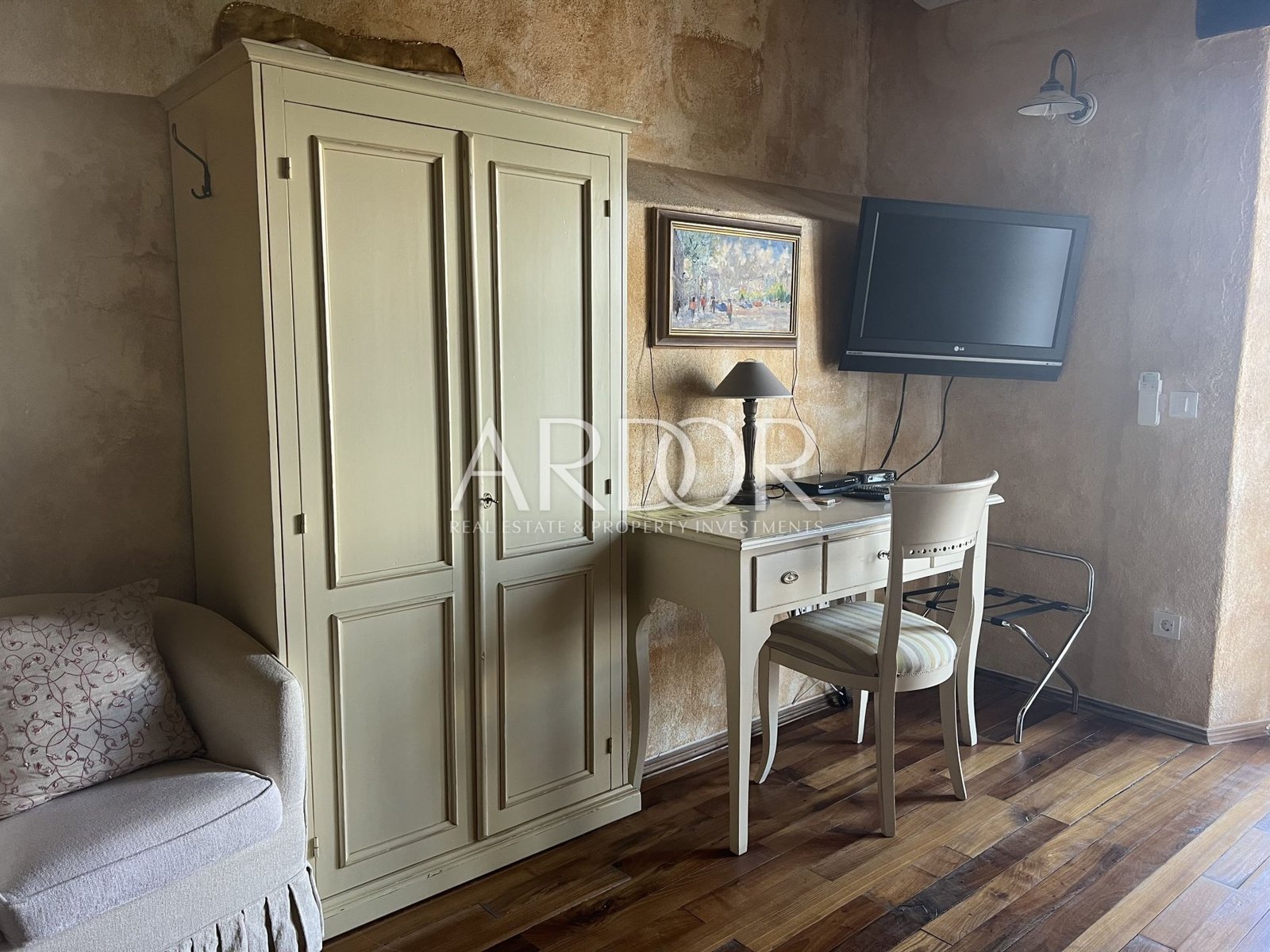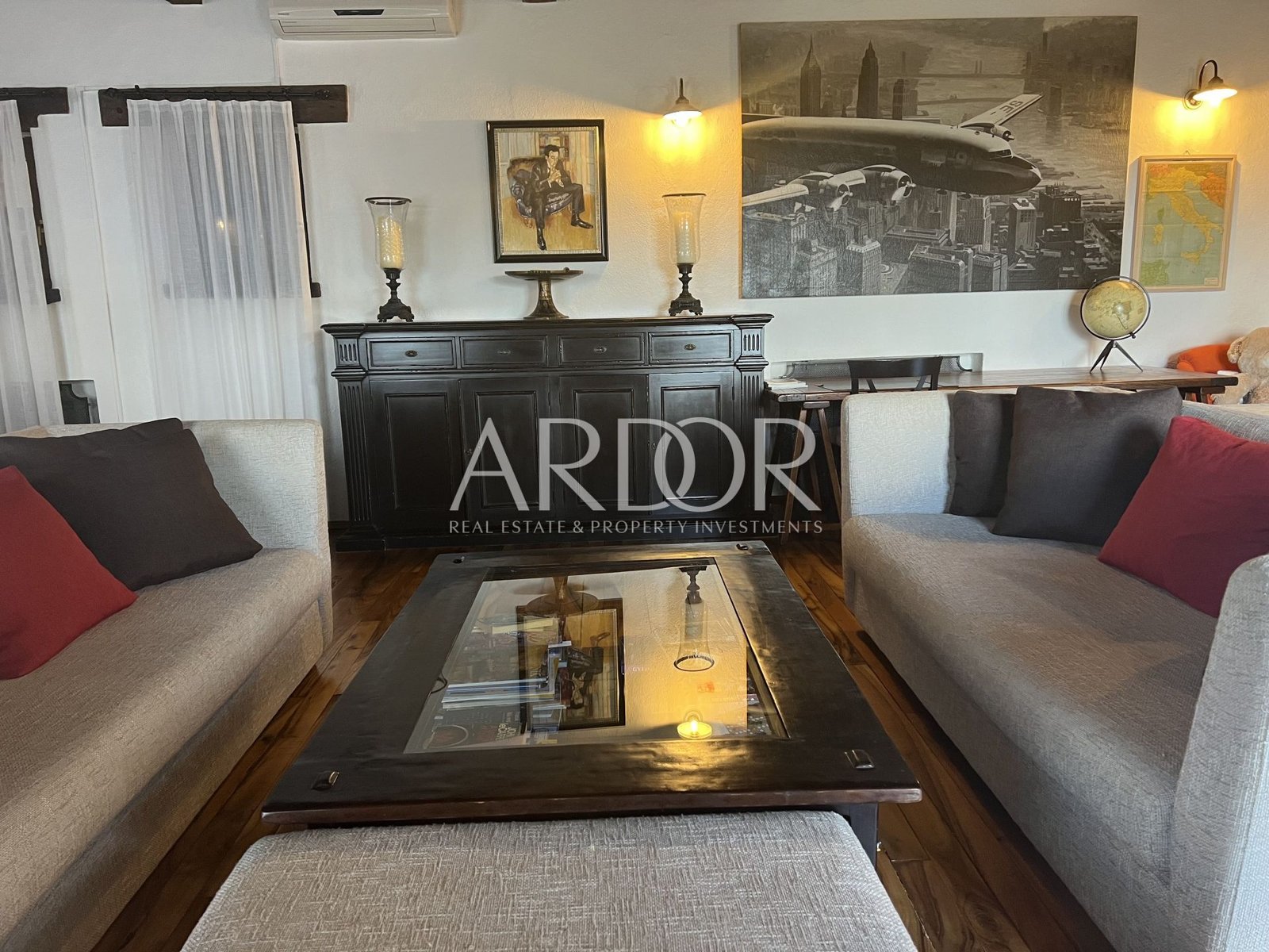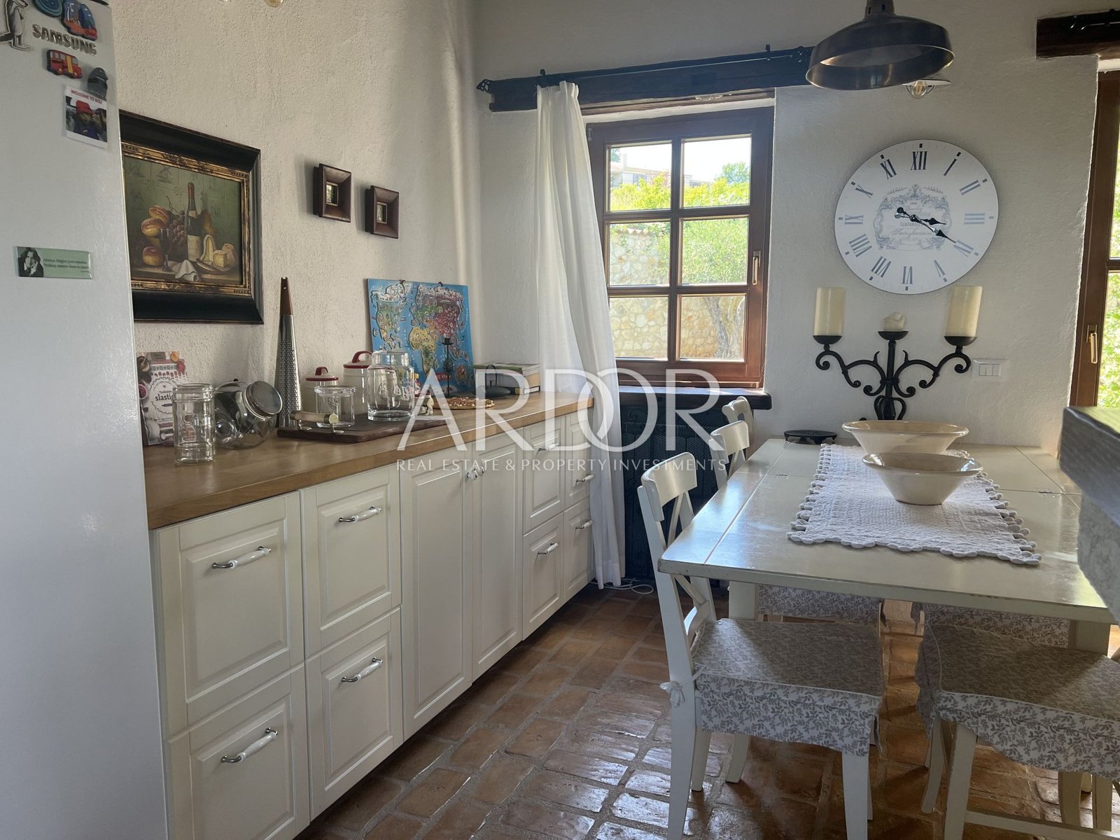 Internal stairs lead to the first floor, where there is an elegantly decorated and equipped study and a spacious bedroom with an open bathroom and a separate toilet. This master bedroom has a fireplace where you can enjoy the cold winter evenings and also an exit to the terrace with a wonderful view. The villa has a basement where there is a room for washing and drying clothes, a sauna and a shower cabin. We also have a luxuriously decorated wine shop where wine lovers can enjoy an intimate atmosphere and socializing. The mentioned rooms have access to the garden. For colder winter days, the house has built-in oil central heating and two fireplaces, and for hot summer days, air conditioners have been installed. The floors are covered with parquet and terracotta, which gives a special charm to the space and goes perfectly with wood and stone.