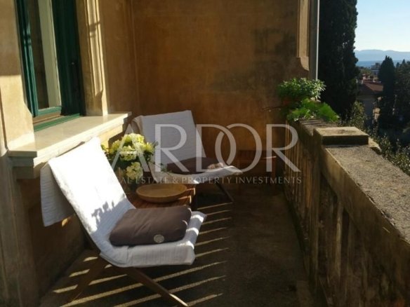 VOLOSKO, udaljena samo stotinjak metara od mora i poznate šetnice Lungo mare, ova impozantna secesijska vila raspolaže sa 450m2, smještena na terenu površine 600m2, u prekrasnom miru i tišini, okružena zelenilom, sa pogledom na more.